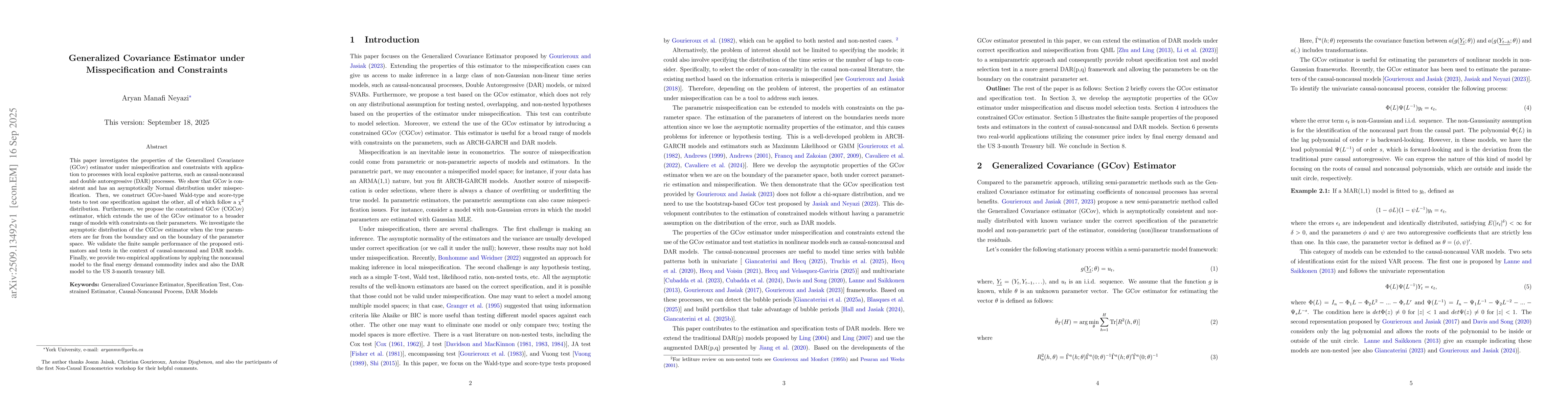 This paper investigates the properties of the Generalized Covariance (GCov) estimator under misspecification and constraints with application to processes with local explosive patterns, such as causal...