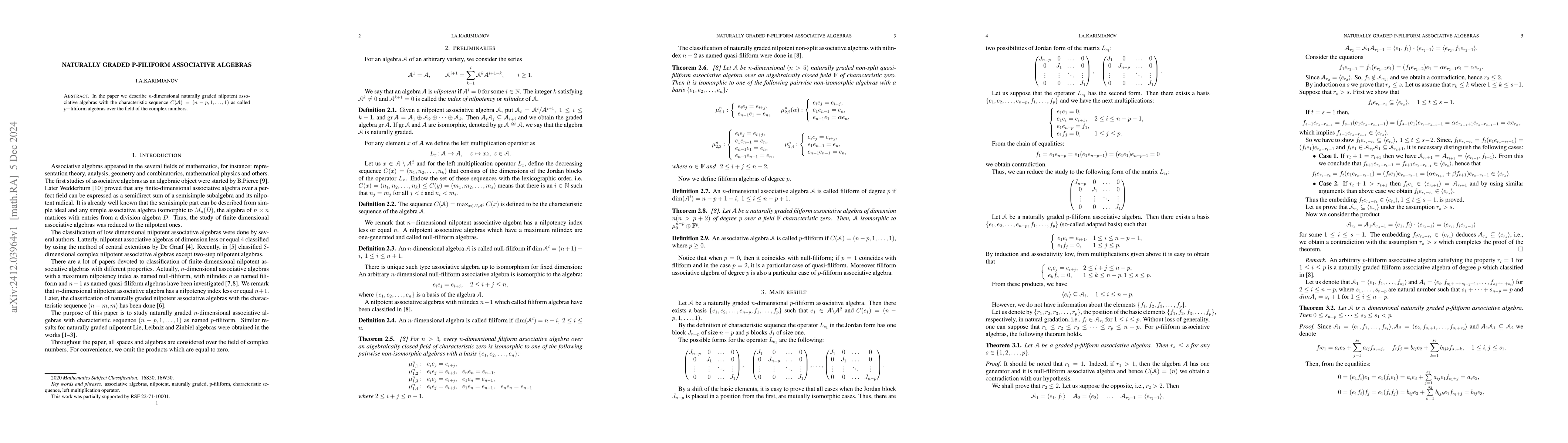 In the paper, we describe $n$-dimensional naturally graded nilpotent associative algebras with the characteristic sequence $C(\mathcal{A})=(n-p,1,\dots,1)$ as called $p-$filiform algebras over the fie...