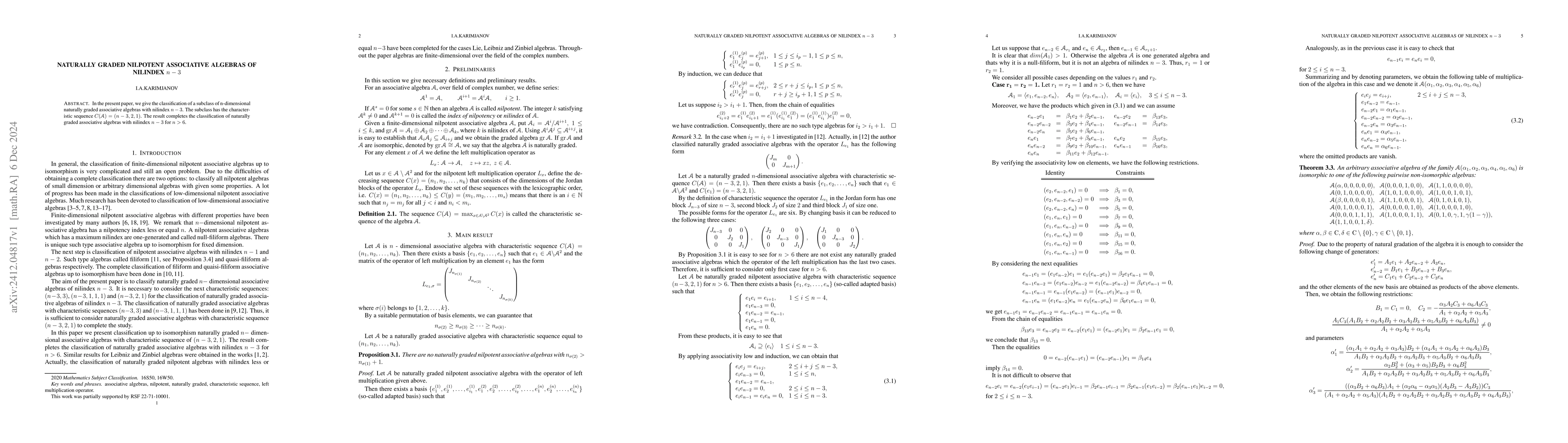 In the present paper, we give the classification of a subclass of n-dimensional naturally graded associative algebras with nilindex $n-3$. The subclass has the characteristic sequence $C(\mathcal{A})=...