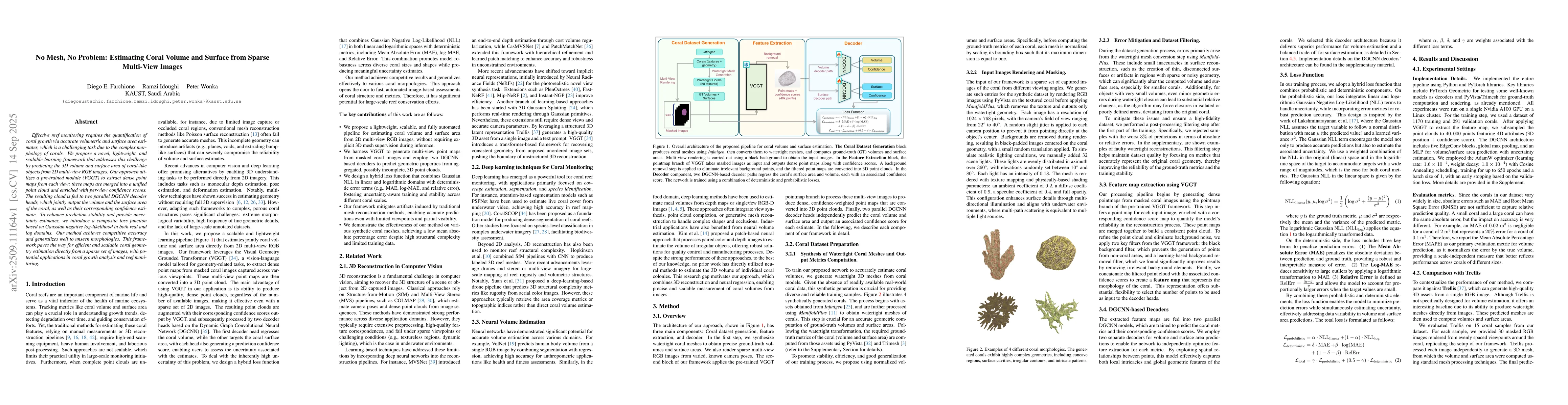 Effective reef monitoring requires the quantification of coral growth via accurate volumetric and surface area estimates, which is a challenging task due to the complex morphology of corals. We propos...