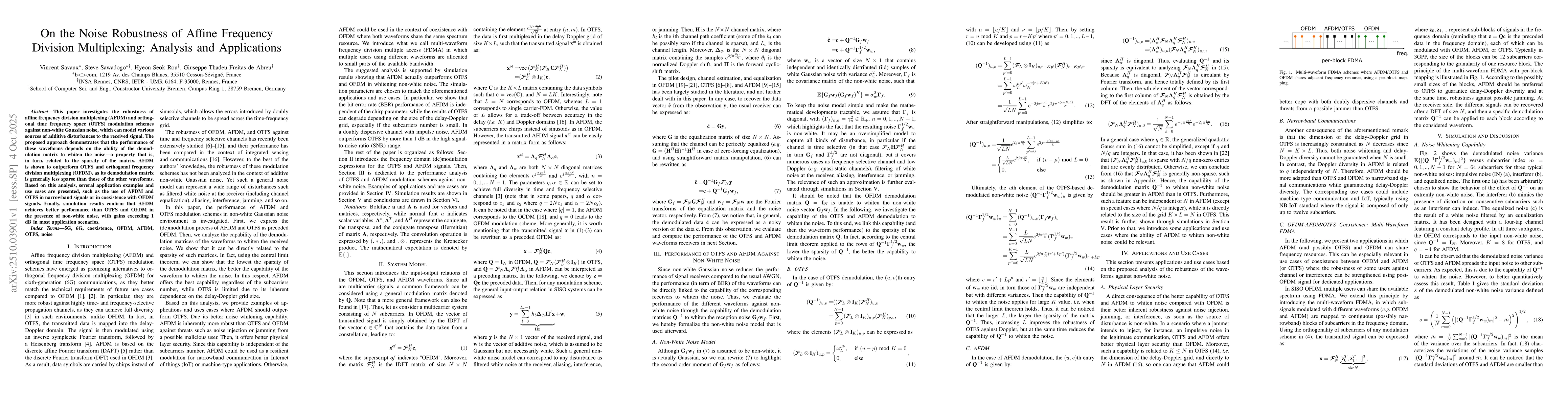 This paper investigates the robustness of affine frequency division multiplexing (AFDM) and orthogonal time frequency space (OTFS) modulation schemes against non-white Gaussian noise, which can model ...