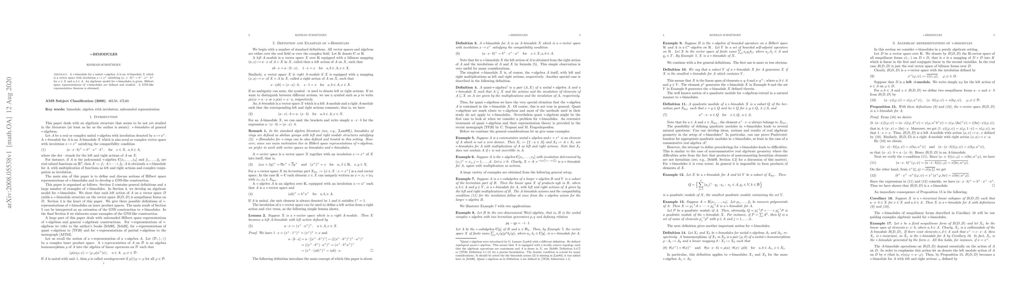 A $*$-bimodule for a unital $*$-algebra $A$ is an $A$-bimodule $X$ which is a vector space with involution $x\mapsto x^+$ satisfying $(a\cdot x\cdot b)^+=b^+\cdot x^+\cdot b^+$ for $x\in X$ and $a,b\in A$. An algebraic model for $*$-bimodules is given. Hilbert space representations of $*$-bimodules are defined and studied. A GNS-like representation theorem is obtained.