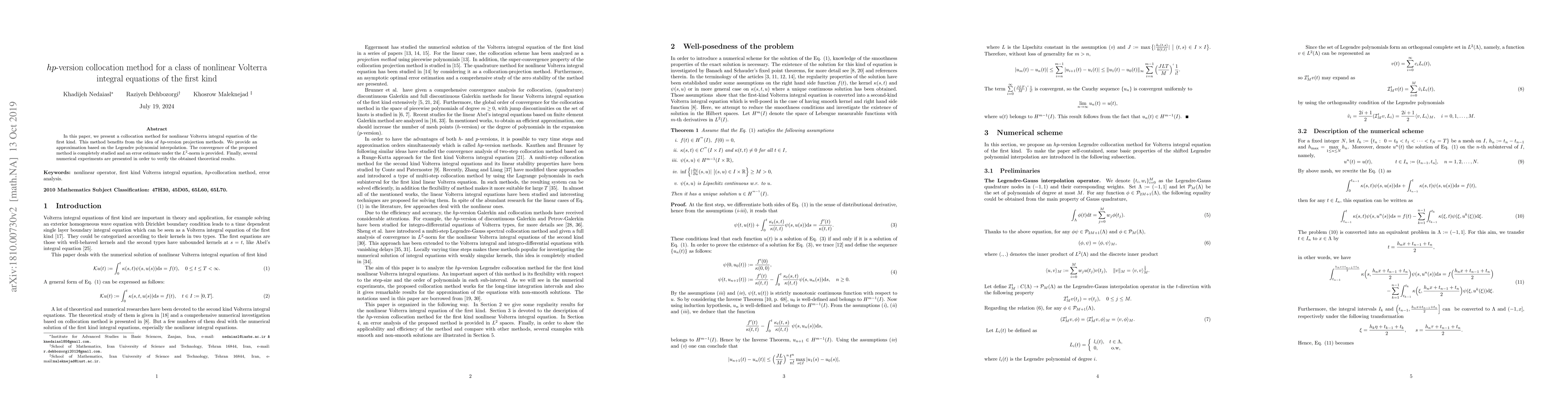 This paper introduces an $hp$-version collocation method for solving nonlinear Volterra integral equations of the first kind, utilizing Legendre polynomial interpolation. The method's convergence is thoroughly analyzed, and numerical experiments validate the theoretical error estimates.
