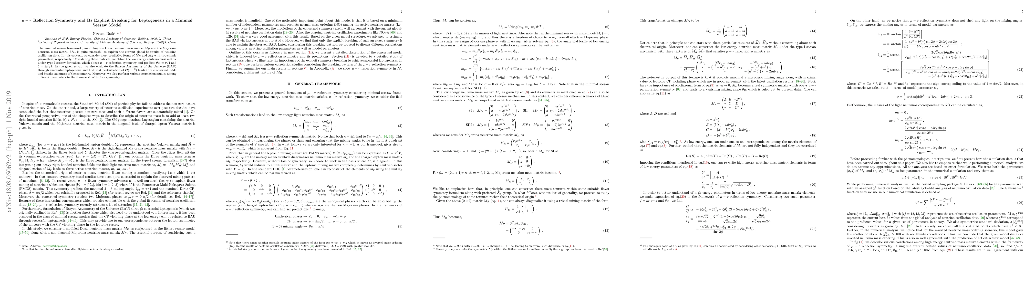 This paper explores a minimal seesaw model where the neutrino mass matrices $M_D$ and $M_R$ exhibit $\mu-\tau$ reflection symmetry, predicting specific values for $\theta_{23}$ and $\delta$. It finds that a small perturbation can break this symmetry and successfully generate the observed Baryon Asymmetry of the Universe through leptogenesis.