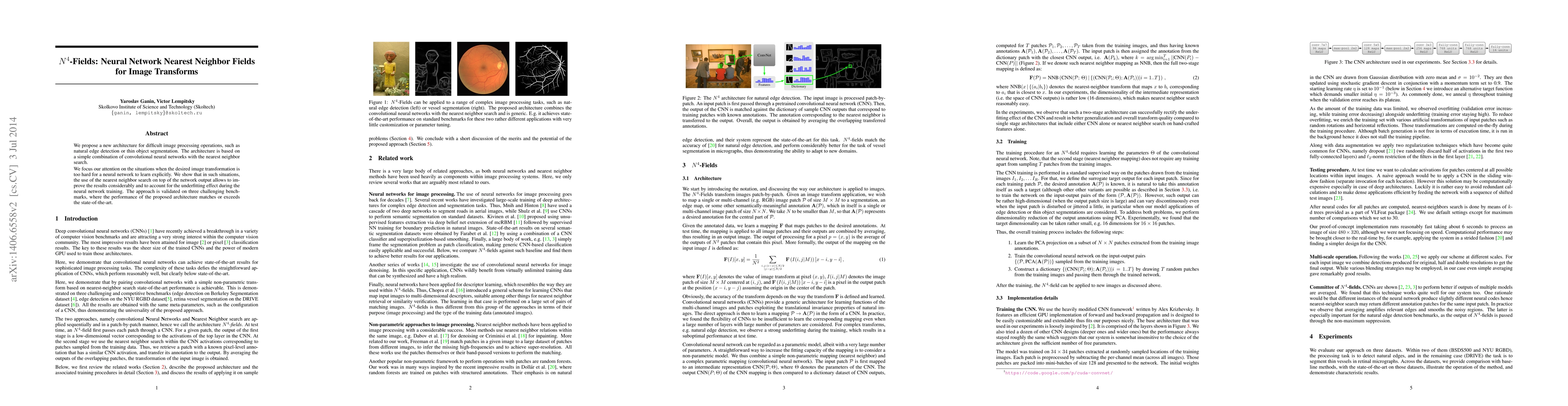 The paper introduces $N^4$-Fields, a novel architecture combining convolutional neural networks with nearest neighbor search for complex image processing tasks. This hybrid approach effectively addresses scenarios where neural networks struggle to learn transformations directly, significantly improving results and mitigating underfitting.