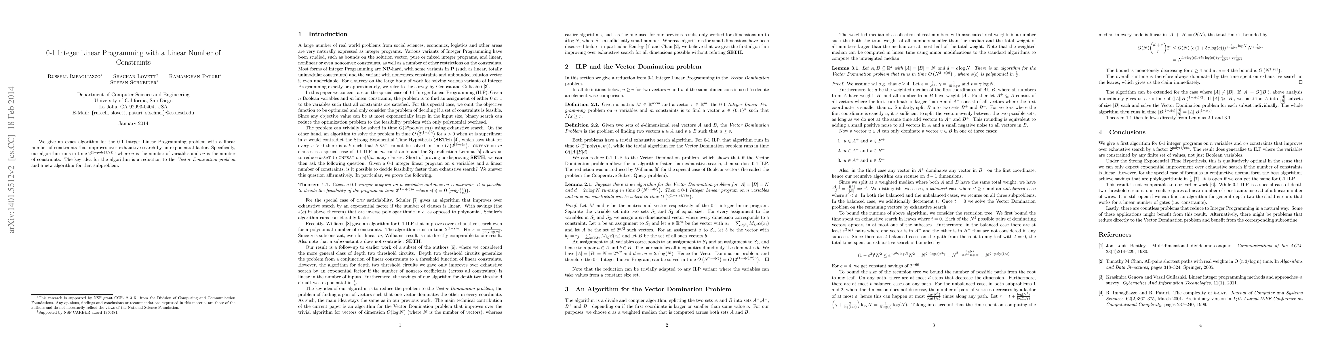 We give an exact algorithm for the 0-1 Integer Linear Programming problem with a linear number of constraints that improves over exhaustive search by an exponential factor. Specifically, our algorithm runs in time $2^{(1-\text{poly}(1/c))n}$ where n is the number of variables and cn is the number of constraints. The key idea for the algorithm is a reduction to the Vector Domination problem and a new algorithm for that subproblem.