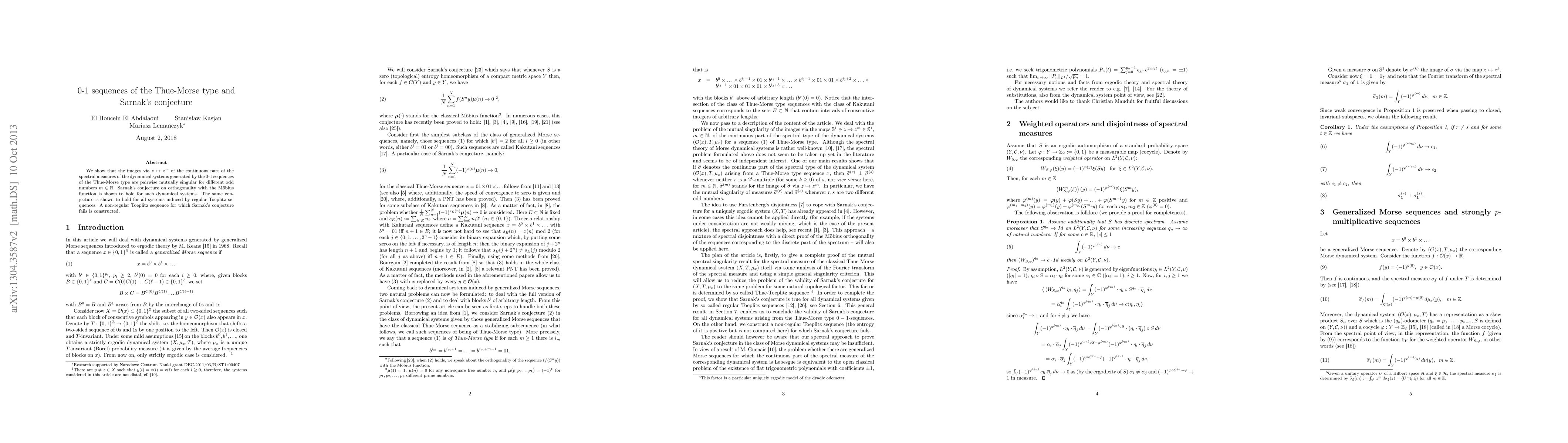We show that the images via $z\mapsto z^m$ of the continuous part of the spectral measures of the dynamical systems generated by the 0-1 sequences of the Thue-Morse type are pairwise mutually singular for different odd numbers $m\in\N$. Sarnak's conjecture on orthogonality with the M\"obius function is shown to hold for such dynamical systems. The same conjecture is shown to hold for all systems induced by regular Toeplitz sequences. A non-regular Toeplitz sequence for which Sarnak's conjecture fails is constructed.