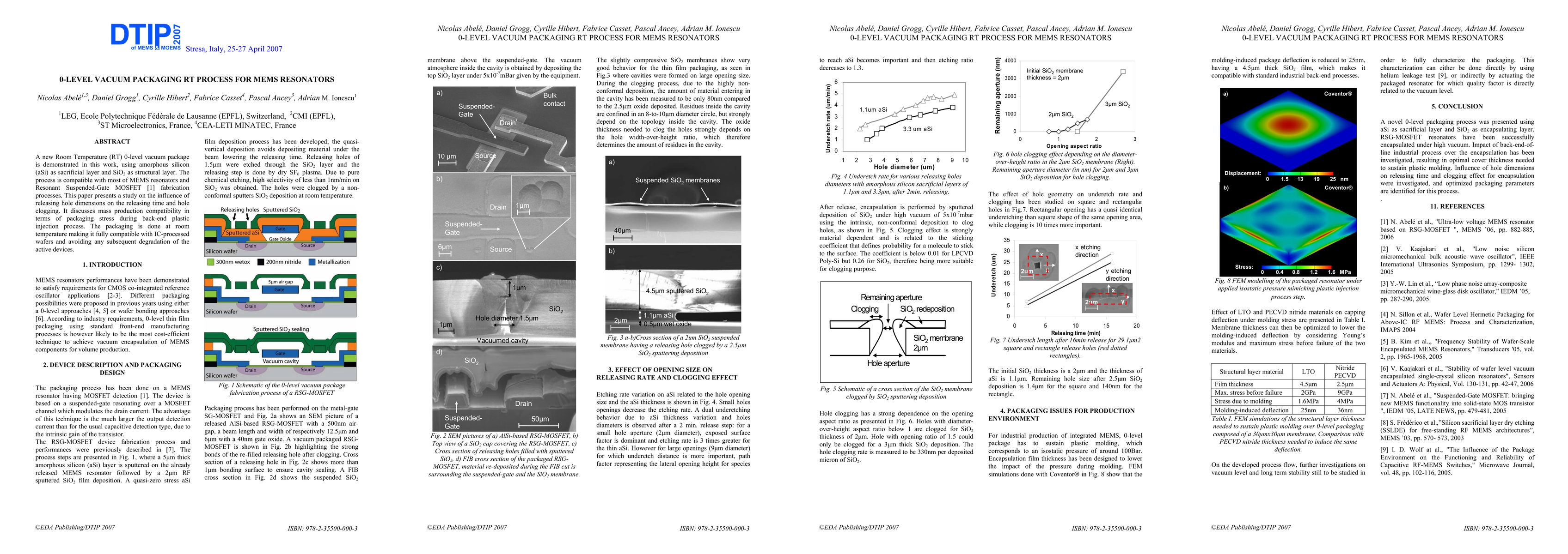 A new Room Temperature (RT) 0-level vacuum package is demonstrated in this work, using amorphous silicon (aSi) as sacrificial layer and SiO2 as structural layer. The process is compatible with most of MEMS resonators and Resonant Suspended-Gate MOSFET [1] fabrication processes. This paper presents a study on the influence of releasing hole dimensions on the releasing time and hole clogging. It discusses mass production compatibility in terms of packaging stress during back-end plastic injection process. The packaging is done at room temperature making it fully compatible with IC-processed wafers and avoiding any subsequent degradation of the active devices.