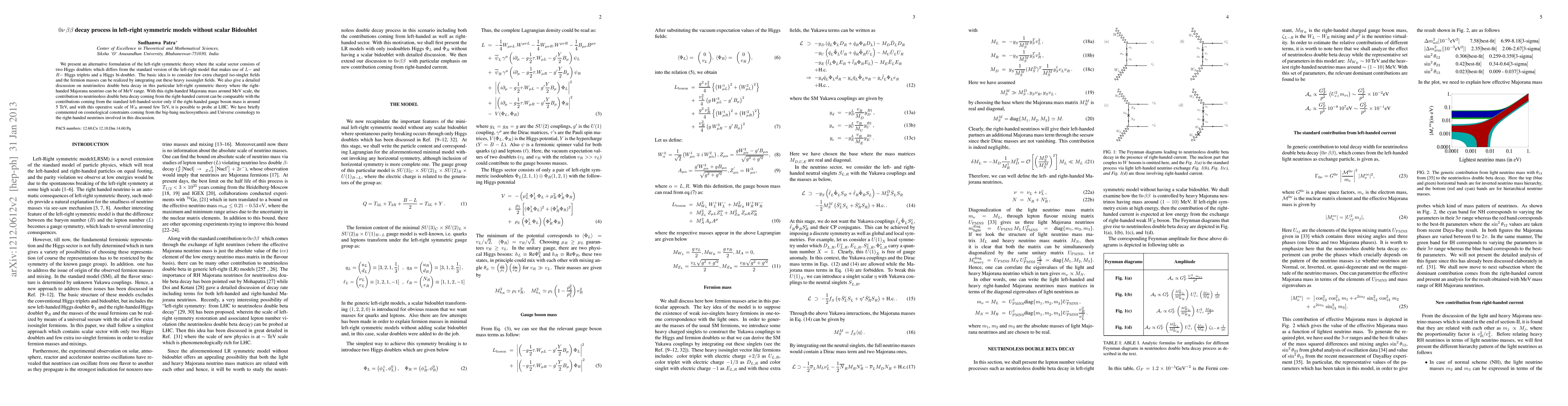 We present an alternative formulation of the left-right symmetric theory where the scalar sector consists of two Higgs doublets which differs from the standard version of the left-right model that makes use of $L-$ and $R-$ Higgs triplets and a Higgs bi-doublet. The basic idea is to consider few extra charged iso-singlet fields and the fermion masses can be realized by integrating out these heavy isosinglet fields. We also give a detailed discussion on neutrinoless double beta decay in this particular left-right symmetric theory where the right-handed Majorana neutrino can be of MeV range. With this right-handed Majorana mass around MeV scale, the contribution to neutrinoless double beta decay coming from the right-handed current can be comparable with the contributions coming from the standard left-handed sector only if the right-handed gauge boson mass is around 5 TeV, and with this operative scale of $W_R$ around few TeV, it is possible to probe at LHC. We have briefly commented on cosmological constraints coming from the big-bang nucleosynthesis and Universe cosmology to the right-handed neutrinos involved in this discussion.