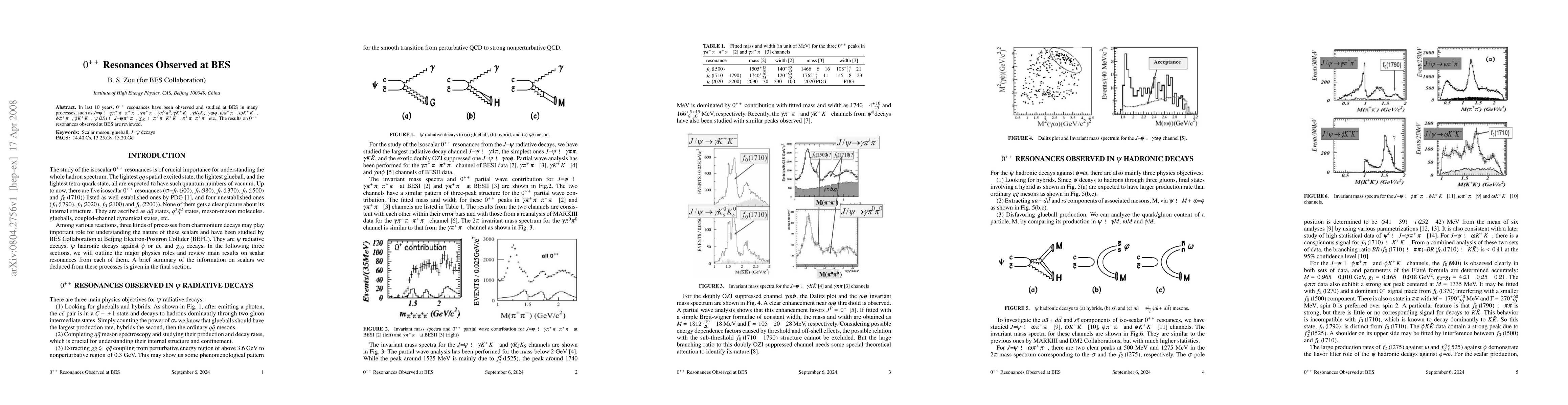 In last 10 years, $0^{++}$ resonances have been observed and studied at BES in many processes, such as $J/\psi\to\gamma\pi^+\pi^-\pi^+\pi^-$, $\gamma\pi^+\pi^-$, $\gamma\pi^0\pi^0$, $\gamma K^+K^-$, $\gamma K_SK_S$, $\gamma\omega\phi$, $\omega\pi^+\pi^-$, $\omega K^+K^-$, $\phi\pi^+\pi^-$, $\phi K^+K^-$, $\psi(2S)\to J/\psi\pi^+\pi^-$, $\chi_{c0}\to\pi^+\pi^-K^+K^-$, $\pi^+\pi^-\pi^+\pi^-$ etc.. The results on $0^{++}$ resonances observed at BES are reviewed.