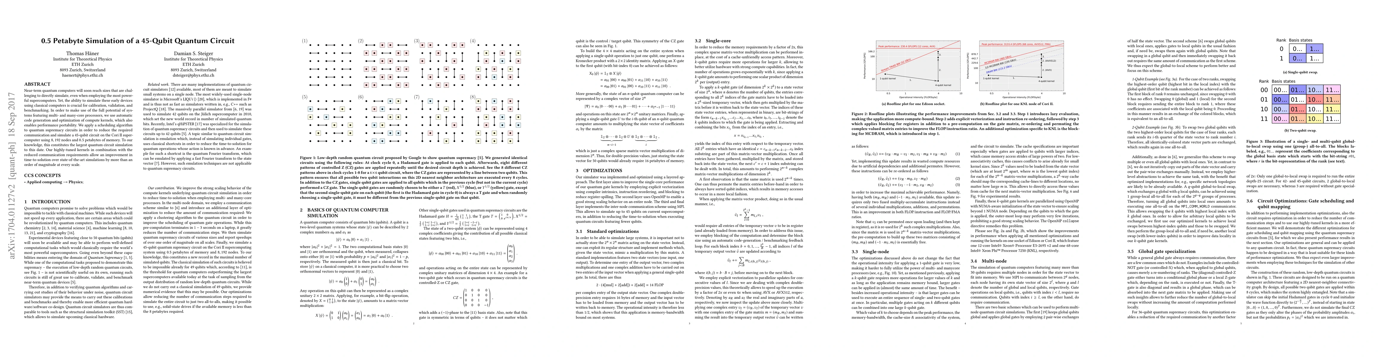 This paper details a groundbreaking simulation of a 45-qubit quantum circuit on the Cori II supercomputer using 8,192 nodes and 0.5 petabytes of memory. The authors employ optimized code generation and scheduling algorithms to achieve significant improvements in simulation speed, marking the largest quantum circuit simulation to date.