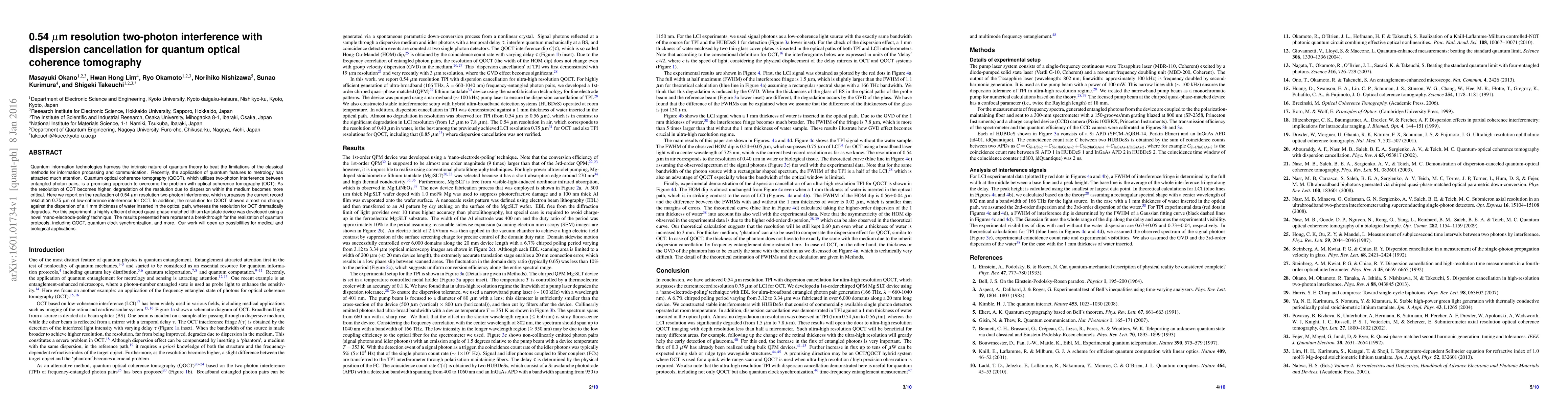 This paper reports on achieving a 0.54 μm resolution in two-photon interference for quantum optical coherence tomography (QOCT), surpassing the previous OCT resolution record. The method effectively cancels dispersion, maintaining resolution even with a 1 mm water path, unlike traditional OCT.