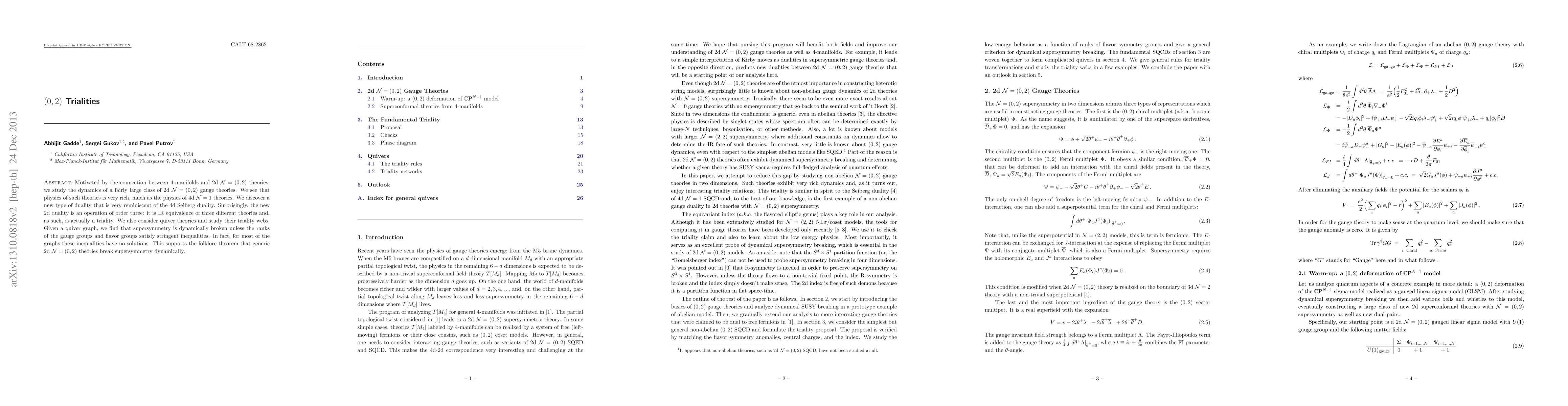 This paper explores the dynamics of 2d N=(0,2) gauge theories, discovering a new type of triality—a three-way infrared equivalence akin to 4d Seiberg duality. It also finds that supersymmetry is dynamically broken in most quiver theories unless specific inequalities are met.