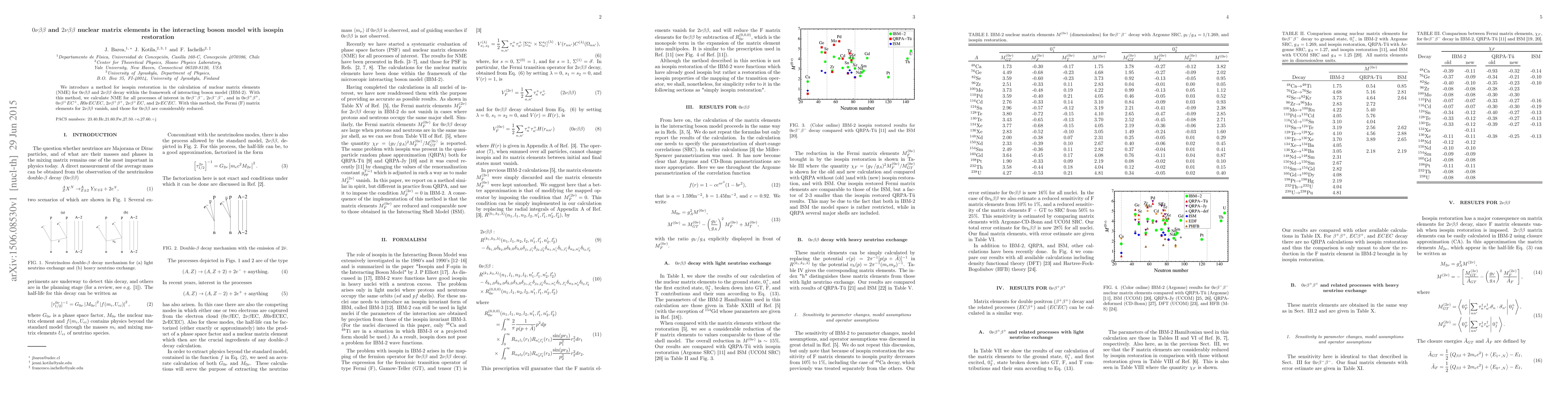 This paper proposes a method for isospin restoration in the interacting boson model to calculate nuclear matrix elements for double beta decay processes, showing that Fermi matrix elements for $2\nu\beta\beta$ decay vanish and those for $0\nu\beta\beta$ decay are significantly reduced.