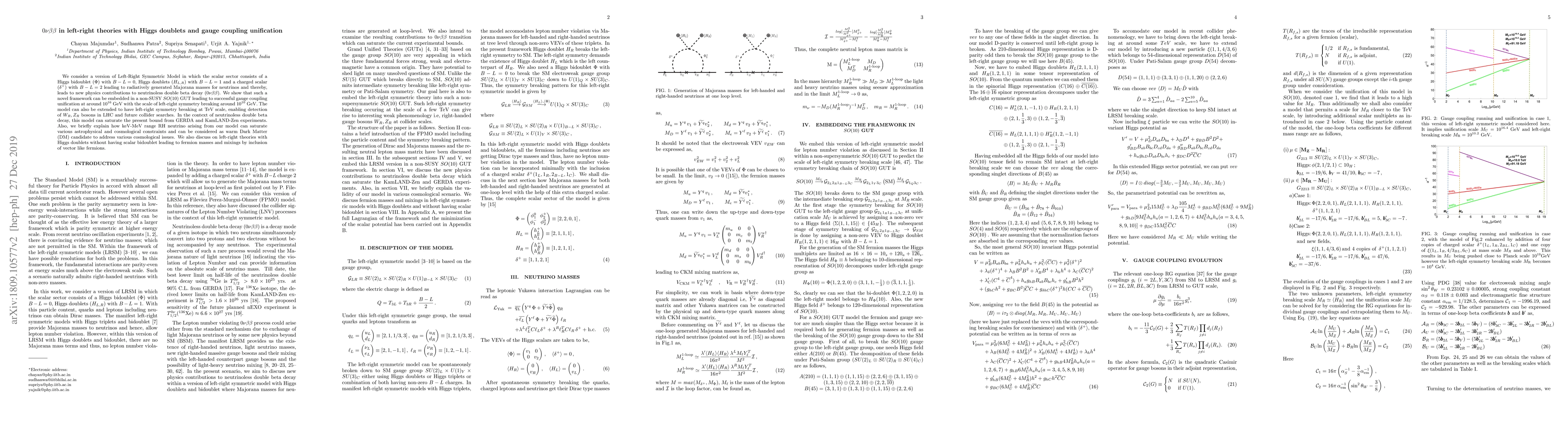 This paper explores a Left-Right Symmetric Model with Higgs bidoublets and doublets, leading to radiatively generated Majorana masses for neutrinos and new contributions to neutrinoless double beta decay. It embeds this framework in a non-SUSY $SO(10)$ GUT for successful gauge coupling unification and discusses the potential for RH neutrino warm Dark Matter.