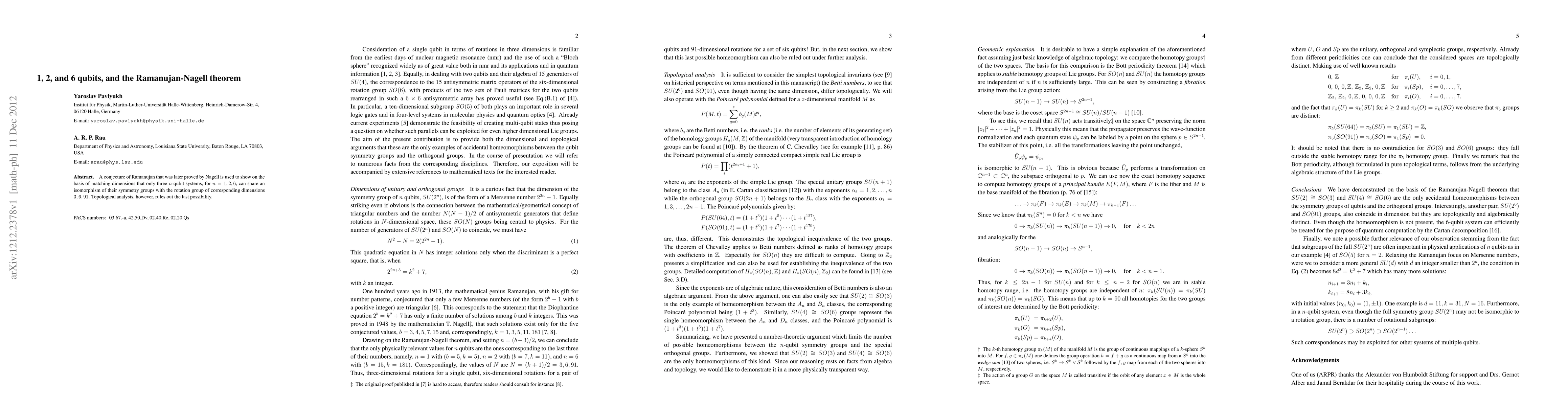 A conjecture of Ramanujan that was later proved by Nagell is used to show on the basis of matching dimensions that only three $n$-qubit systems, for $n=1, 2, 6$, can share an isomorphism of their symmetry groups with the rotation group of corresponding dimensions $3, 6, 91$. Topological analysis, however, rules out the last possibility.