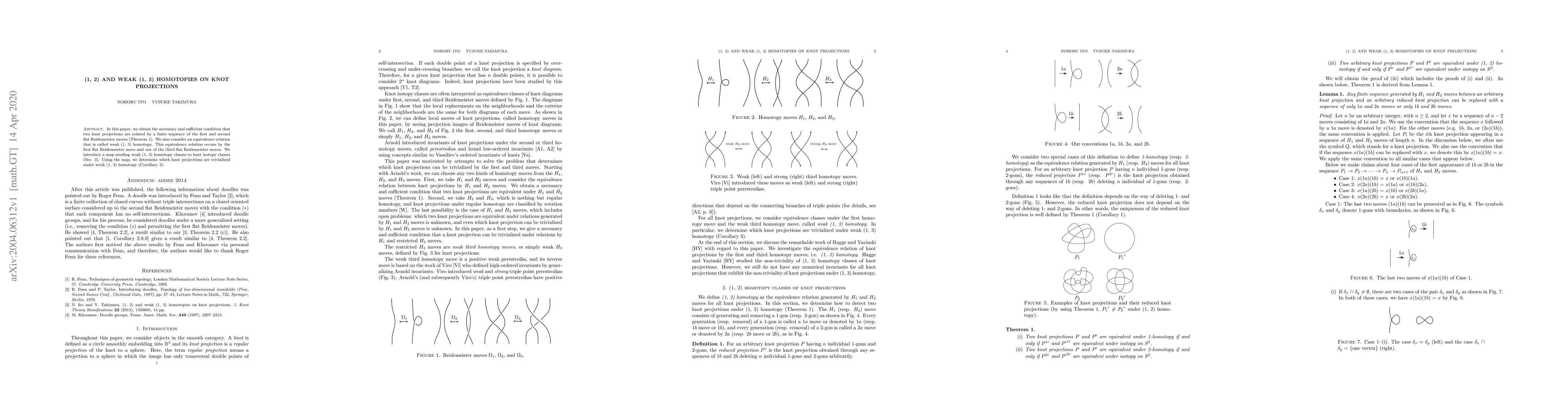 In this paper, we obtain the necessary and sufficient condition that two knot projections are related by a finite sequence of the first and second flat Reidemeister moves (Theorem 1). We also consider an equivalence relation that is called weak (1, 3) homotopy. This equivalence relation occurs by the first flat Reidemeister move and one of the third flat Reidemeister moves. We introduce a map sending weak (1, 3) homotopy classes to knot isotopy classes (Sec. 3). Using the map, we determine which knot projections are trivialized under weak (1, 3) homotopy (Corollary 3).