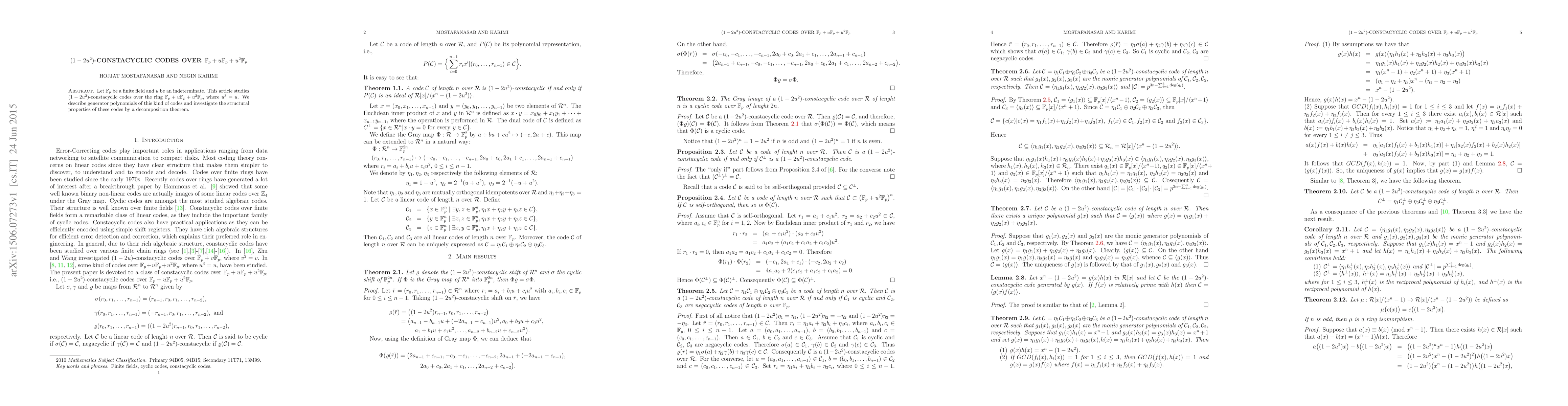 Let $\mathbb{F}_p$ be a finite field and $u$ be an indeterminate. This article studies $(1-2u^2)$-constacyclic codes over the ring $\mathbb{F}_p+u\mathbb{F}_p+u^2\mathbb{F}_p$, where $u^3=u$. We describe generator polynomials of this kind of codes and investigate the structural properties of these codes by a decomposition theorem.