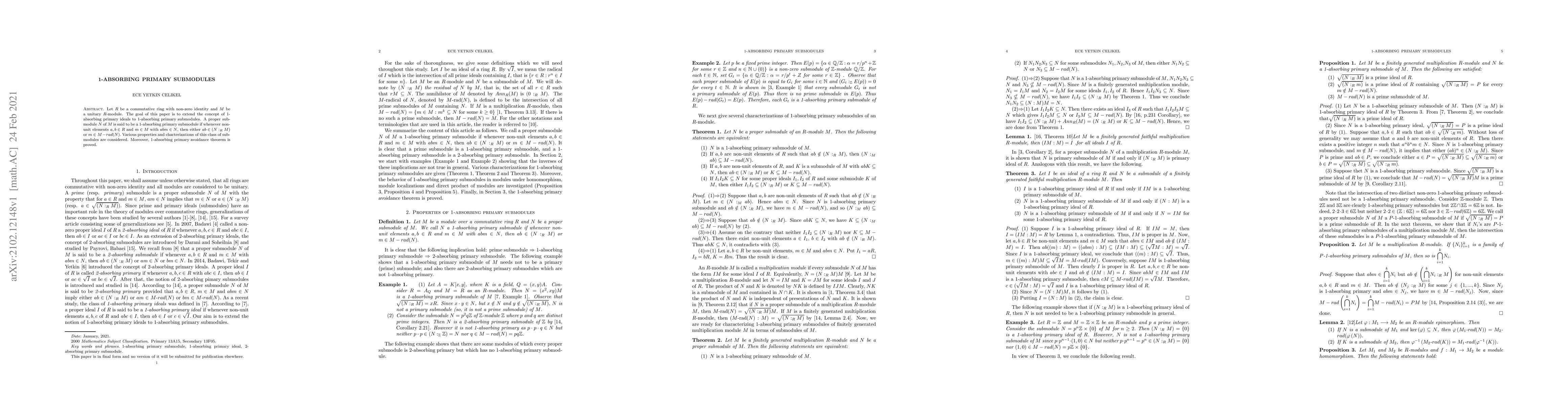 The paper introduces and develops the theory of 1-absorbing primary submodules, proving their key properties and establishing a novel avoidance theorem.