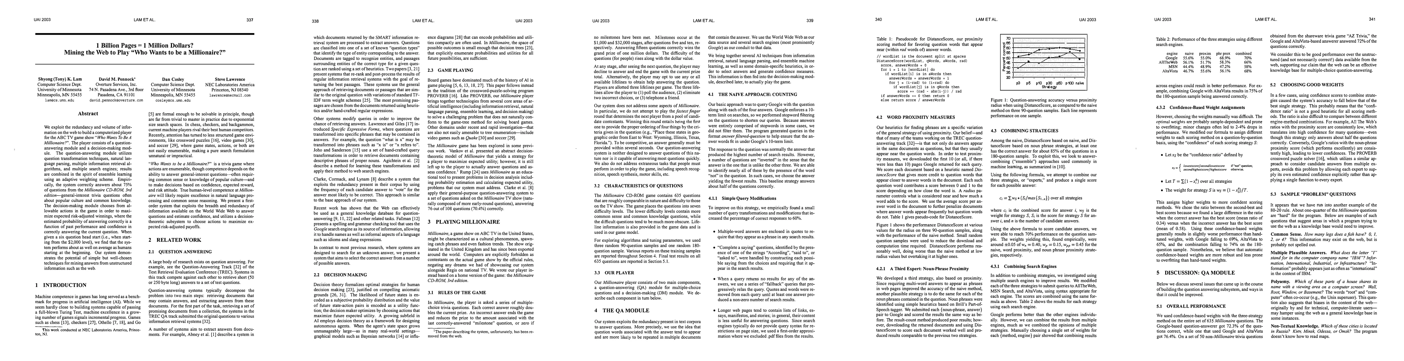 We exploit the redundancy and volume of information on the web to build a computerized player for the ABC TV game show 'Who Wants To Be A Millionaire?' The player consists of a question-answering module and a decision-making module. The question-answering module utilizes question transformation techniques, natural language parsing, multiple information retrieval algorithms, and multiple search engines; results are combined in the spirit of ensemble learning using an adaptive weighting scheme. Empirically, the system correctly answers about 75% of questions from the Millionaire CD-ROM, 3rd edition - general-interest trivia questions often about popular culture and common knowledge. The decision-making module chooses from allowable actions in the game in order to maximize expected risk-adjusted winnings, where the estimated probability of answering correctly is a function of past performance and confidence in in correctly answering the current question. When given a six question head start (i.e., when starting from the $2,000 level), we find that the system performs about as well on average as humans starting at the beginning. Our system demonstrates the potential of simple but well-chosen techniques for mining answers from unstructured information such as the web.