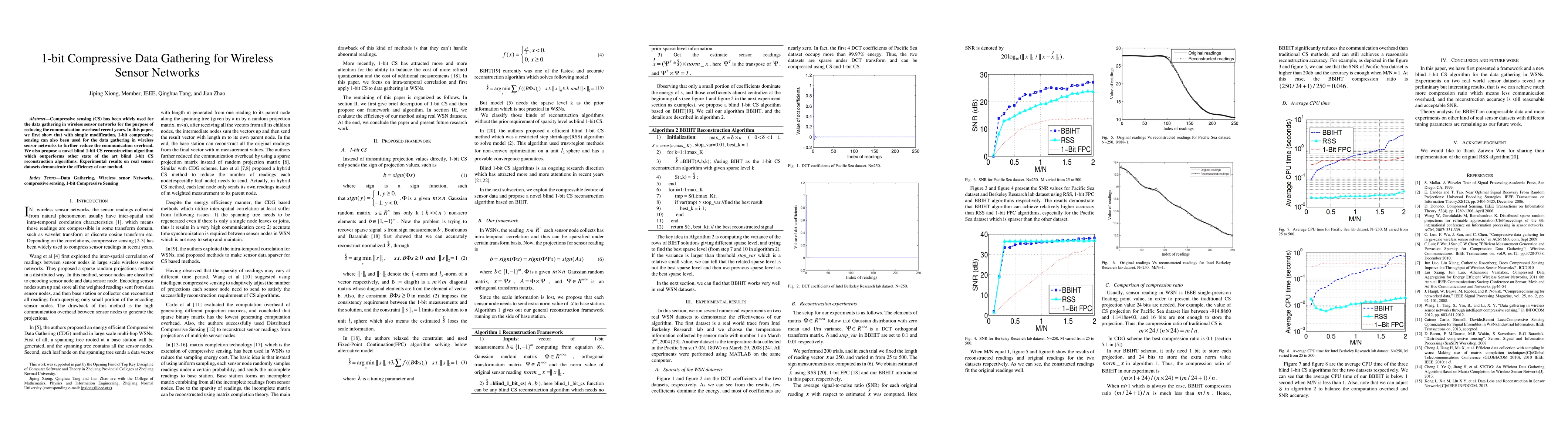 This paper proposes a 1-bit compressive sensing method for wireless sensor networks to minimize communication overhead, and introduces a superior blind 1-bit CS reconstruction algorithm, which outperforms existing methods, as validated by real sensor dataset experiments.