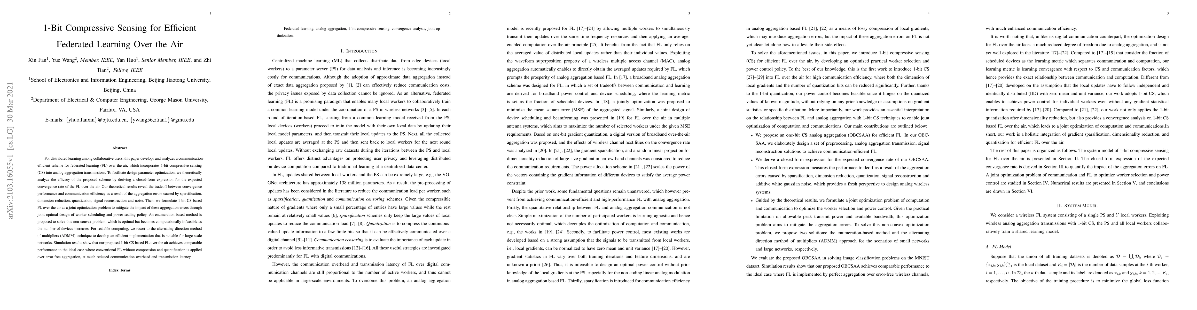 This paper introduces a 1-bit compressive sensing scheme for efficient federated learning over the air, reducing communication overhead and transmission latency while maintaining comparable performance to ideal cases, and proposes an efficient implementation using alternating direction method of multipliers.