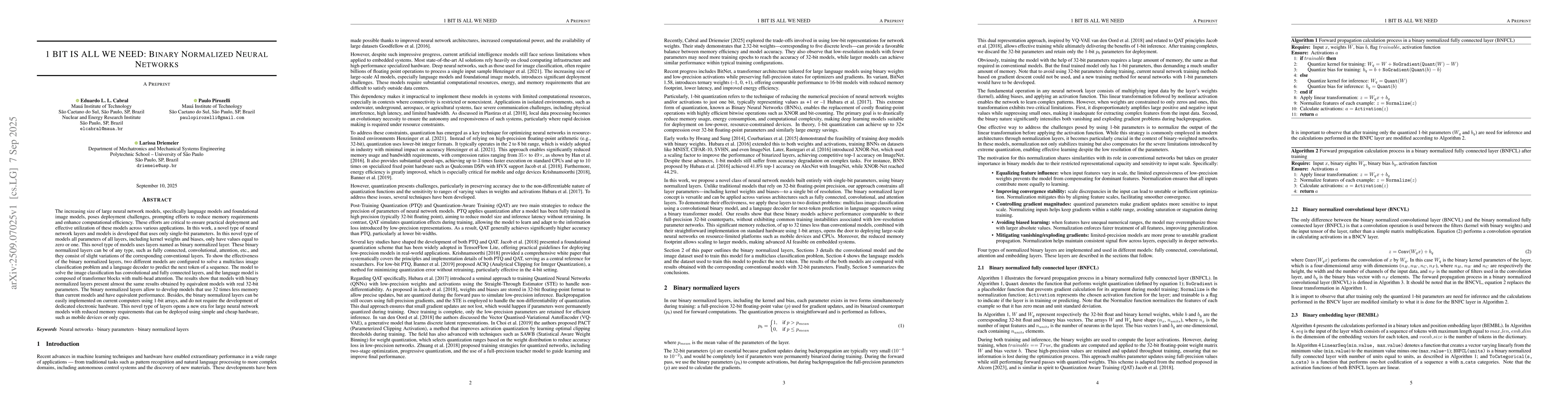 The increasing size of large neural network models, specifically language models and foundational image models, poses deployment challenges, prompting efforts to reduce memory requirements and enhance computational efficiency. These efforts are critical to ensure practical deployment and effective utilization of these models across various applications. In this work, a novel type of neural network layers and models is developed that uses only single-bit parameters. In this novel type of models all parameters of all layers, including kernel weights and biases, only have values equal to zero or one. This novel type of models uses layers named as binary normalized layer. These binary normalized layers can be of any type, such as fully connected, convolutional, attention, etc., and they consist of slight variations of the corresponding conventional layers. To show the effectiveness of the binary normalized layers, two different models are configured to solve a multiclass image classification problem and a language decoder to predict the next token of a sequence. The model to solve the image classification has convolutional and fully connected layers, and the language model is composed of transformer blocks with multi-head attention. The results show that models with binary normalized layers present almost the same results obtained by equivalent models with real 32-bit parameters. The binary normalized layers allow to develop models that use 32 times less memory than current models and have equivalent performance. Besides, the binary normalized layers can be easily implemented on current computers using 1-bit arrays, and do not require the development of dedicated electronic hardware. This novel type of layers opens a new era for large neural network models with reduced memory requirements that can be deployed using simple and cheap hardware, such as mobile devices or only cpus.