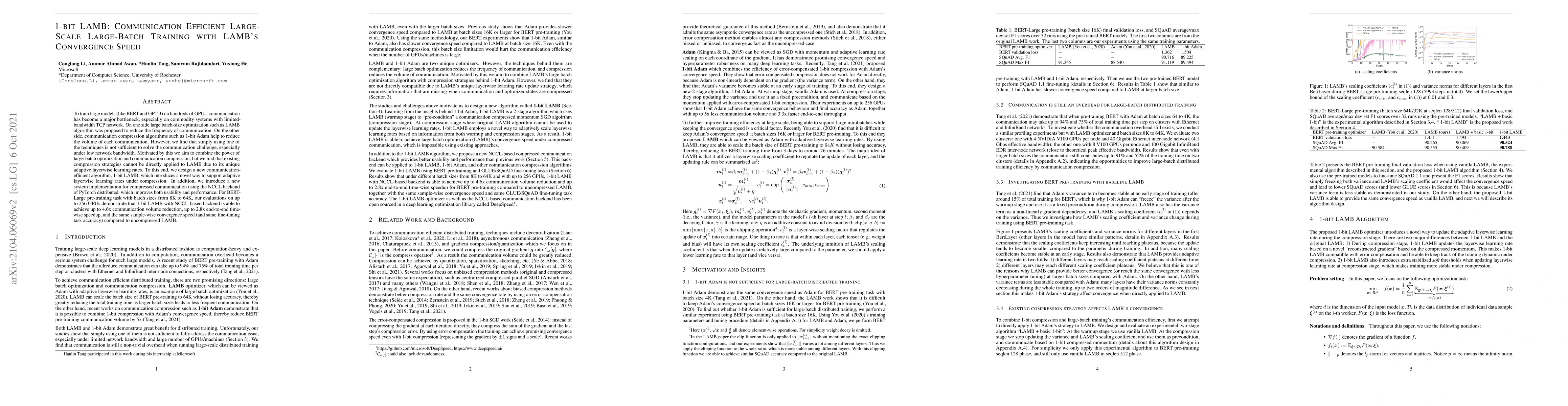 The paper introduces 1-bit LAMB, a communication-efficient training algorithm that combines large batch-size optimization with 1-bit compression to reduce communication bottlenecks in large-scale model training. It achieves significant reductions in communication volume and training time while maintaining LAMB's convergence speed and accuracy.