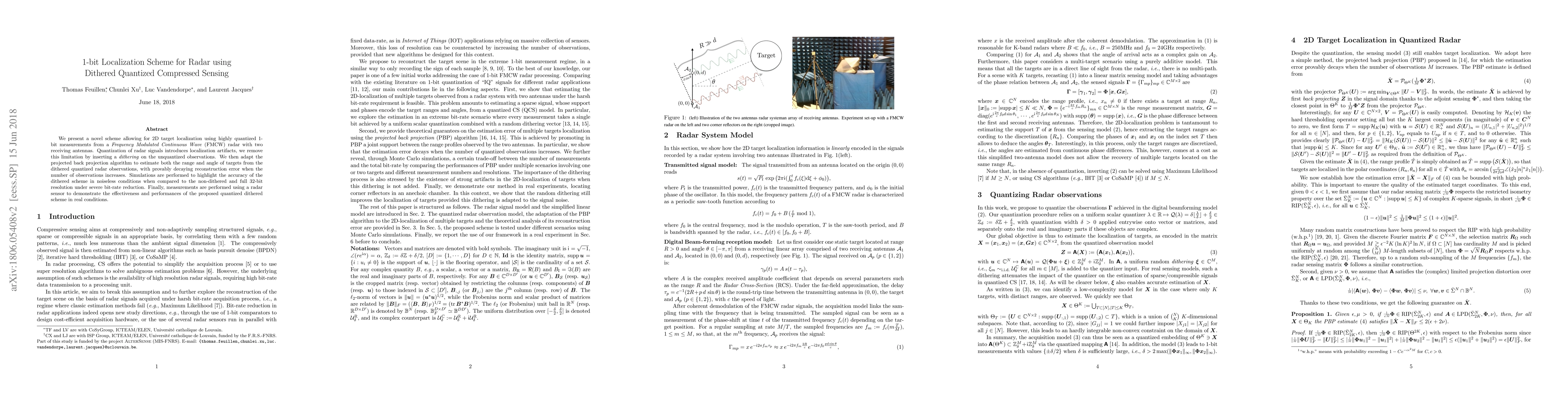 We present a novel scheme allowing for 2D target localization using highly quantized 1-bit measurements from a Frequency Modulated Continuous Wave (FMCW) radar with two receiving antennas. Quantization of radar signals introduces localization artifacts, we remove this limitation by inserting a dithering on the unquantized observations. We then adapt the projected back projection algorithm to estimate both the range and angle of targets from the dithered quantized radar observations, with provably decaying reconstruction error when the number of observations increases. Simulations are performed to highlight the accuracy of the dithered scheme in noiseless conditions when compared to the non-dithered and full 32-bit resolution under severe bit-rate reduction. Finally, measurements are performed using a radar sensor to demonstrate the effectiveness and performances of the proposed quantized dithered scheme in real conditions.