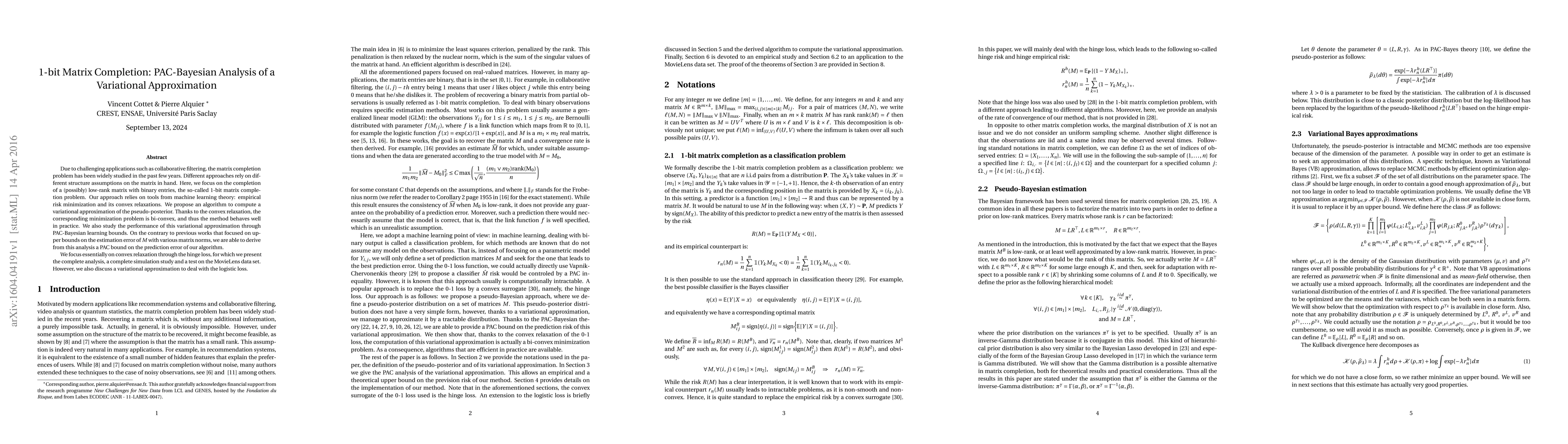 This paper proposes a variational approximation algorithm for solving the 1-bit matrix completion problem, leveraging PAC-Bayesian bounds to analyze its performance. The method is shown to be effective through simulations and empirical testing on the MovieLens dataset, providing a PAC bound on prediction error.