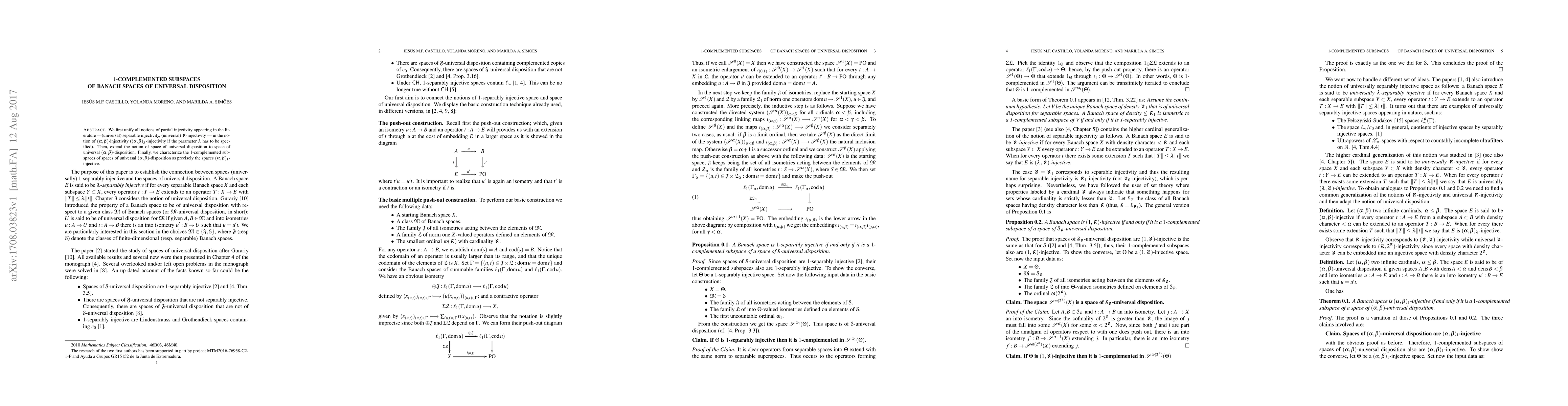 We first unify all notions of partial injectivity appearing in the literature ---(universal) separable injectivity, (universal) $\aleph$-injectivity --- in the notion of $(\alpha, \beta)$-injectivity ($(\alpha, \beta)_\lambda$-injectivity if the parameter $\lambda$ has to be specified). Then, extend the notion of space of universal disposition to space of universal $(\alpha, \beta)$-disposition. Finally, we characterize the $1$-complemented subspaces of spaces of universal $(\alpha, \beta)$-disposition as precisely the spaces $(\alpha, \beta)_1$-injective.