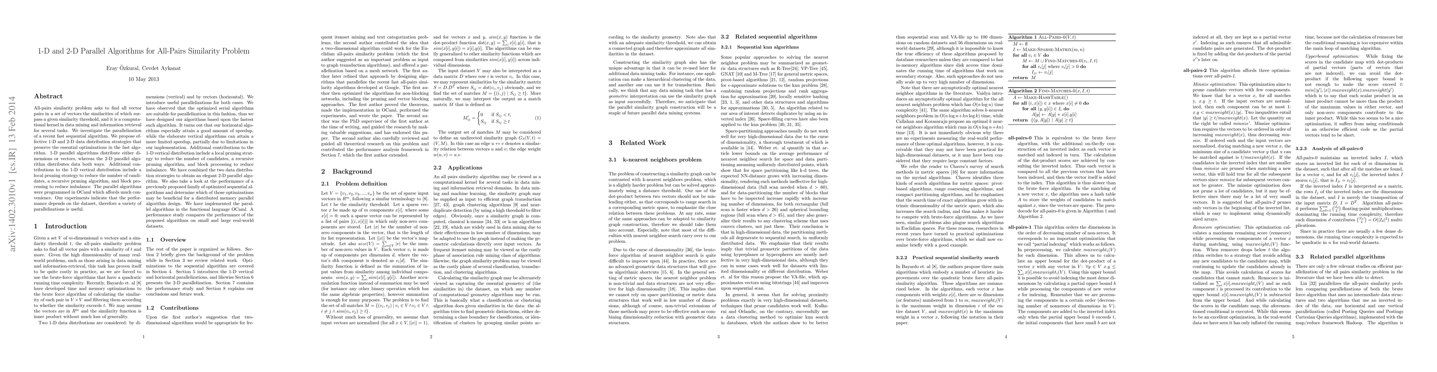 This paper proposes 1-D and 2-D parallel algorithms to solve the all-pairs similarity problem, distributing data either dimensionally or both ways to optimize performance. Experiments show that performance varies with datasets, indicating the utility of diverse parallelization strategies.