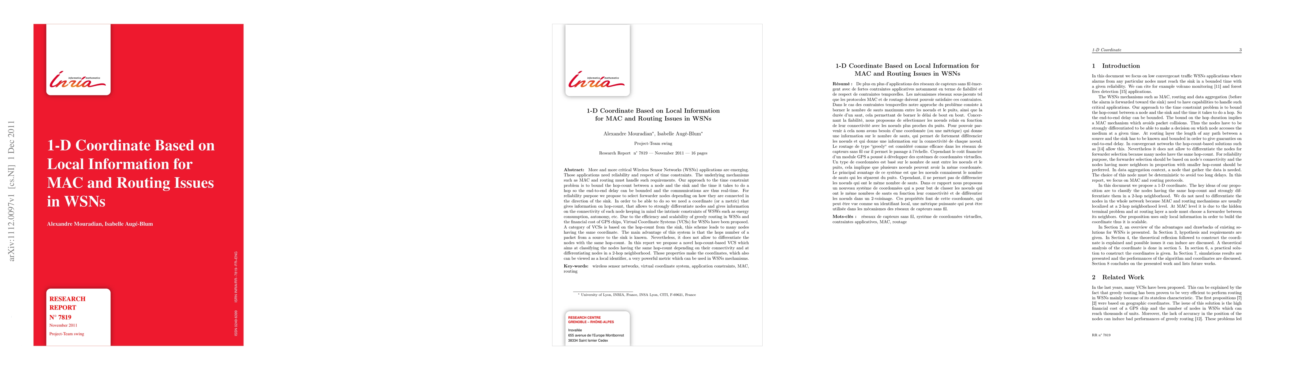 More and more critical Wireless Sensor Networks (WSNs) applications are emerging. Those applications need reliability and respect of time constraints. The underlying mechanisms such as MAC and routing must handle such requirements. Our approach to the time constraint problem is to bound the hop-count between a node and the sink and the time it takes to do a hop so the end-to-end delay can be bounded and the communications are thus real-time. For reliability purpose we propose to select forwarder nodes depending on how they are connected in the direction of the sink. In order to be able to do so we need a coordinate (or a metric) that gives information on hop-count, that allows to strongly differentiate nodes and gives information on the connectivity of each node keeping in mind the intrinsic constraints of WSWs such as energy consumption, autonomy, etc. Due to the efficiency and scalability of greedy routing in WSNs and the financial cost of GPS chips, Virtual Coordinate Systems (VCSs) for WSNs have been proposed. A category of VCSs is based on the hop-count from the sink, this scheme leads to many nodes having the same coordinate. The main advantage of this system is that the hops number of a packet from a source to the sink is known. Nevertheless, it does not allow to differentiate the nodes with the same hop-count. In this report we propose a novel hop-count-based VCS which aims at classifying the nodes having the same hop-count depending on their connectivity and at differentiating nodes in a 2-hop neighborhood. Those properties make the coordinates, which also can be viewed as a local identifier, a very powerful metric which can be used in WSNs mechanisms.