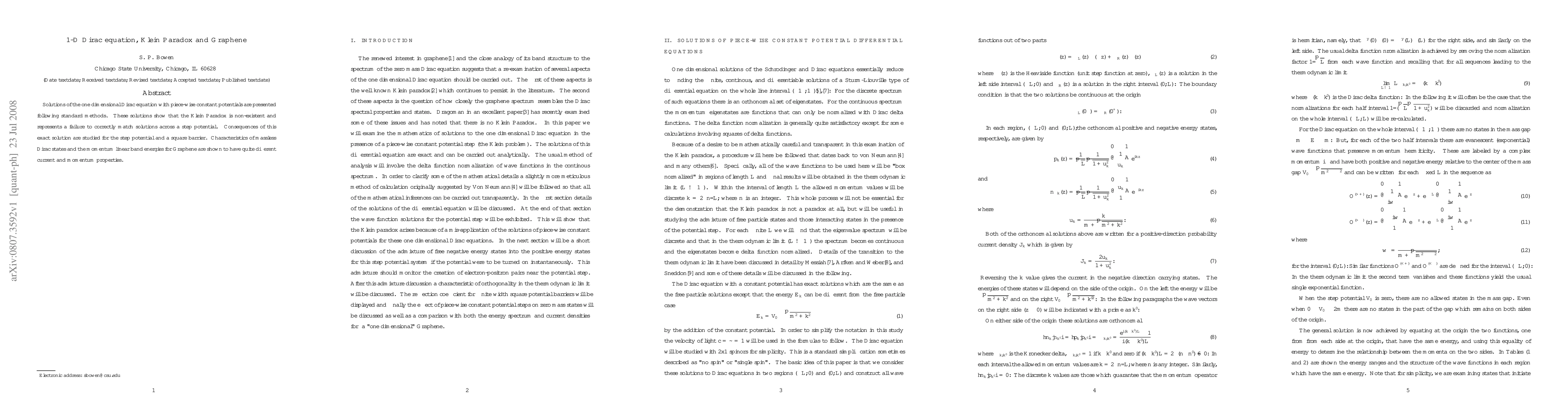 This paper resolves the Klein Paradox in the 1-D Dirac equation by correctly matching solutions across a step potential, demonstrating its non-existence. It also explores the distinct current and momentum properties of massless Dirac states and Graphene's linear band energies.