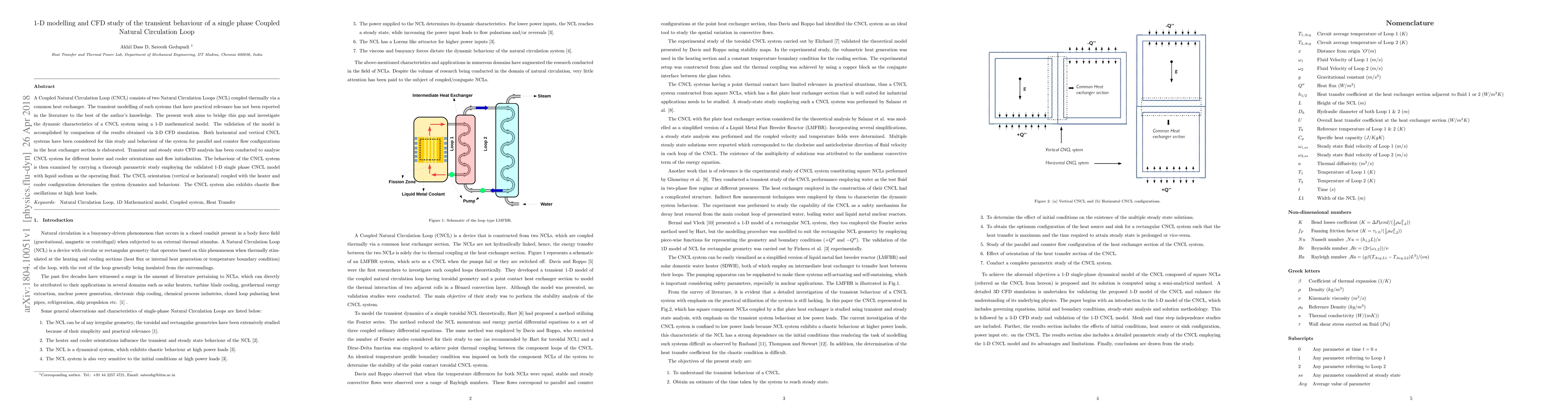 A Coupled Natural Circulation Loop (CNCL) consists of two Natural Circulation Loops (NCL) coupled thermally via a common heat exchanger. The transient modelling of such systems that have practical relevance has not been reported in the literature to the best of the author's knowledge. The present work aims to bridge this gap and investigate the dynamic characteristics of a CNCL system using a 1-D mathematical model. The validation of the model is accomplished by comparison of the results obtained via 3-D CFD simulation. Both horizontal and vertical CNCL systems have been considered for this study and behaviour of the system for parallel and counter flow configurations in the heat exchanger section is elaborated. Transient and steady state CFD analysis has been conducted to analyse CNCL system for different heater and cooler orientations and flow initialisation. The behaviour of the CNCL system is then examined by carrying a thorough parametric study employing the validated 1-D single phase CNCL model with liquid sodium as the operating fluid. The CNCL orientation (vertical or horizontal) coupled with the heater and cooler configuration determines the system dynamics and behaviour. The CNCL system also exhibits chaotic flow oscillations at high heat loads.