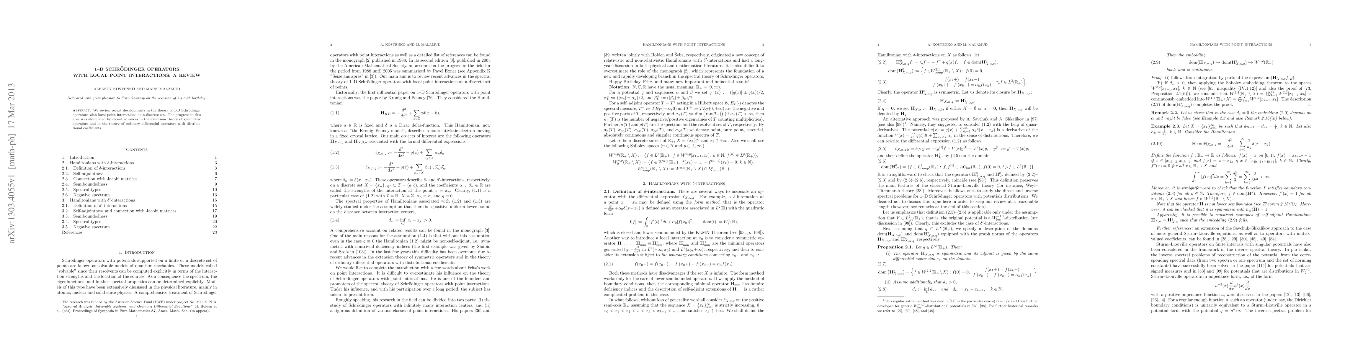 This paper reviews recent advancements in the theory of 1-D Schrödinger operators featuring local point interactions on a discrete set, driven by progress in symmetric operator extension theory and differential operators with distributional coefficients.