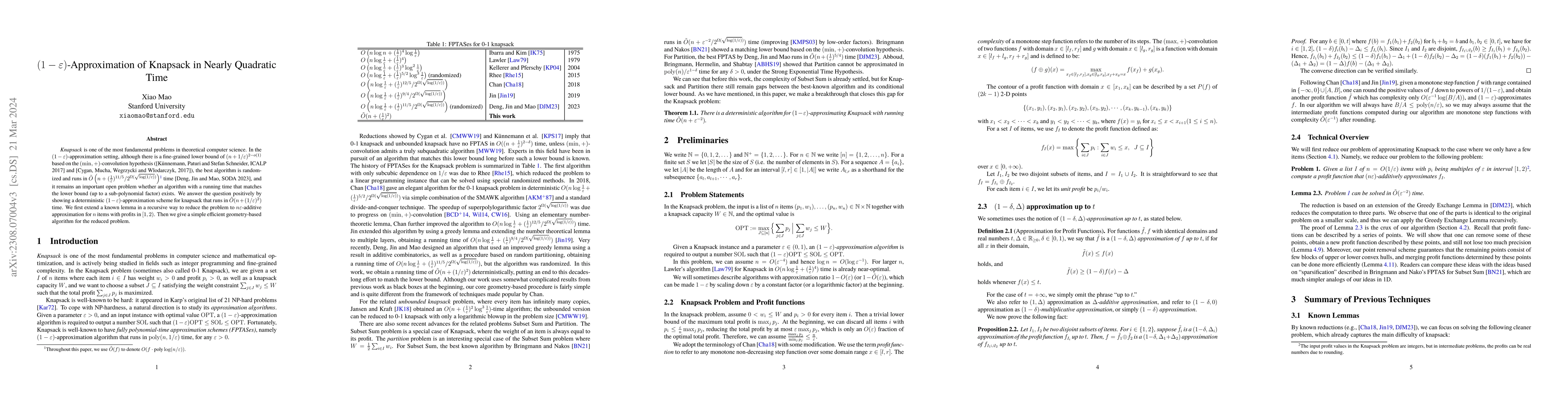 This paper presents a deterministic $(1 - \epsilon)$-approximation algorithm for the knapsack problem that runs in nearly quadratic time, $\tilde O(n + (1 / \epsilon)^2)$. The authors address the longstanding challenge of improving the running time to match the known lower bounds, proposing an efficient geometry-based approach after reducing the problem.