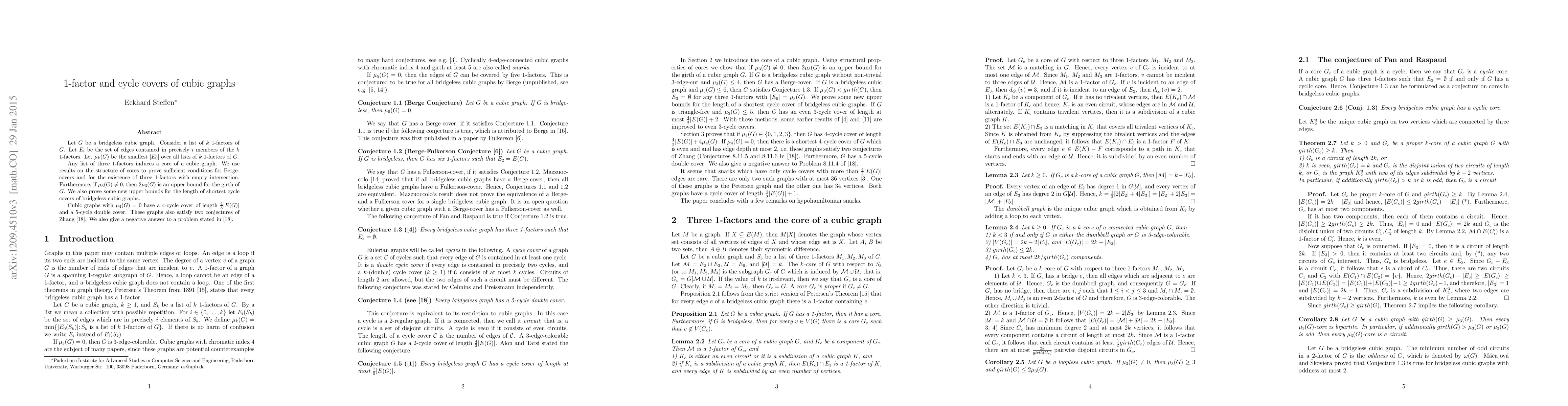 Let $G$ be a bridgeless cubic graph. Consider a list of $k$ 1-factors of $G$. Let $E_i$ be the set of edges contained in precisely $i$ members of the $k$ 1-factors. Let $\mu_k(G)$ be the smallest $|E_0|$ over all lists of $k$ 1-factors of $G$. Any list of three 1-factors induces a core of a cubic graph. We use results on the structure of cores to prove sufficient conditions for Berge-covers and for the existence of three 1-factors with empty intersection. Furthermore, if $\mu_3(G) \not = 0$, then $2 \mu_3(G)$ is an upper bound for the girth of $G$. We also prove some new upper bounds for the length of shortest cycle covers of bridgeless cubic graphs. Cubic graphs with $\mu_4(G) = 0$ have a 4-cycle cover of length $\frac{4}{3} |E(G)|$ and a 5-cycle double cover. These graphs also satisfy two conjectures of Zhang. We also give a negative answer to a problem of Zhang.