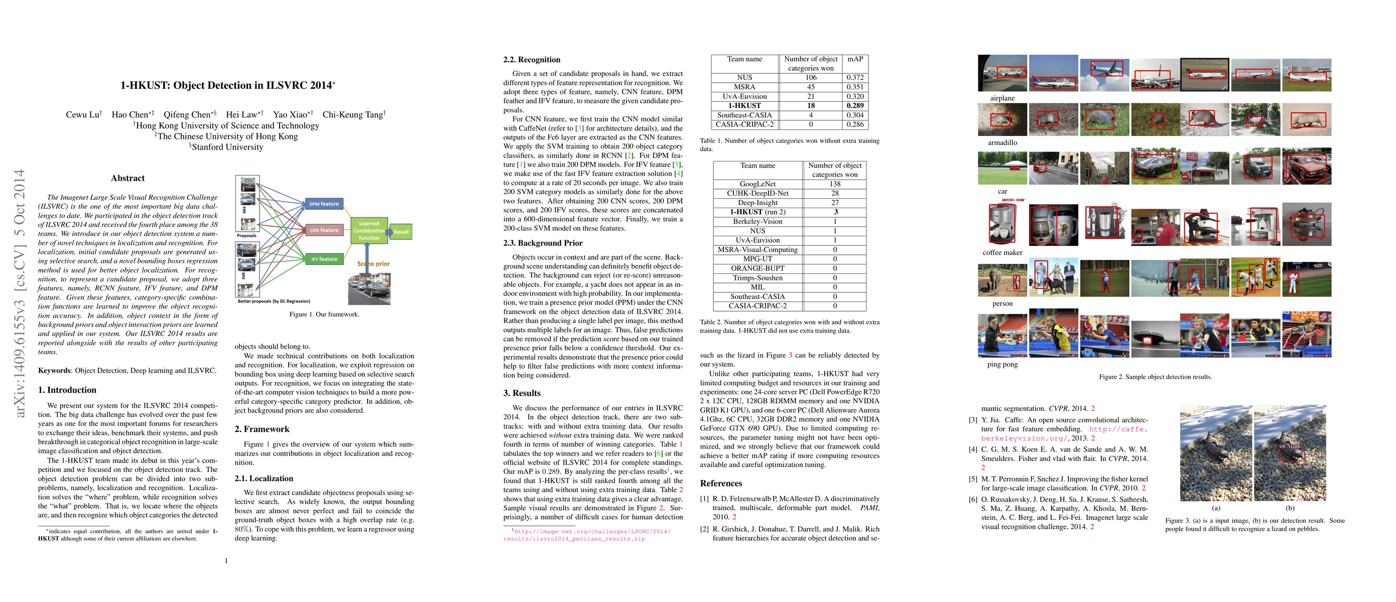 The Imagenet Large Scale Visual Recognition Challenge (ILSVRC) is the one of the most important big data challenges to date. We participated in the object detection track of ILSVRC 2014 and received the fourth place among the 38 teams. We introduce in our object detection system a number of novel techniques in localization and recognition. For localization, initial candidate proposals are generated using selective search, and a novel bounding boxes regression method is used for better object localization. For recognition, to represent a candidate proposal, we adopt three features, namely, RCNN feature, IFV feature, and DPM feature. Given these features, category-specific combination functions are learned to improve the object recognition rate. In addition, object context in the form of background priors and object interaction priors are learned and applied in our system. Our ILSVRC 2014 results are reported alongside with the results of other participating teams.
