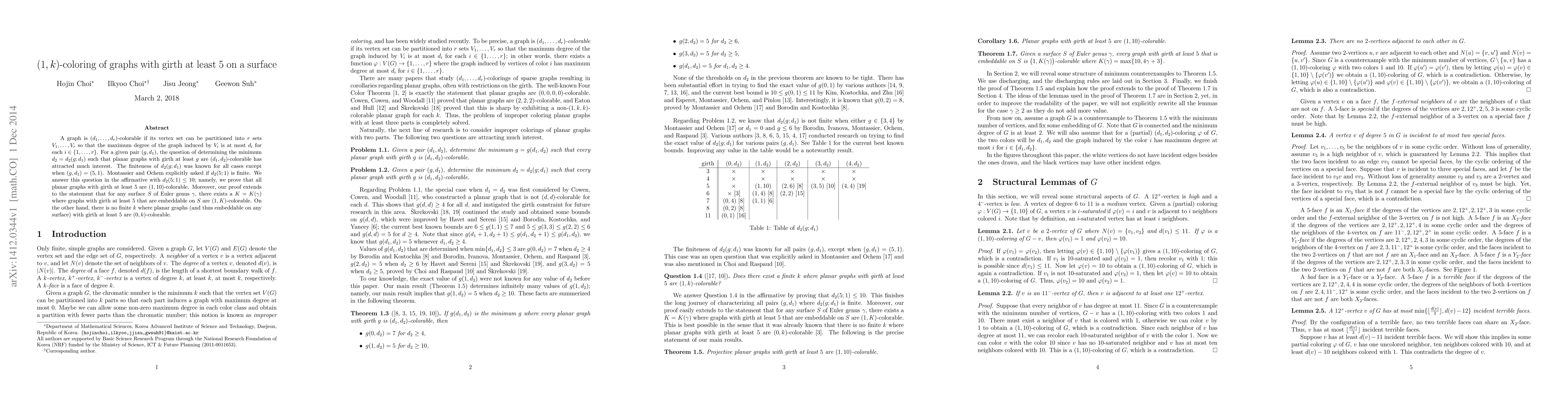 This paper proves that planar graphs with girth at least 5 are $(1, 10)$-colorable, answering a question about the finiteness of $d_2(5; 1)$. The result extends to any surface of Euler genus $\gamma$, showing that such graphs are $(1, K(\gamma))$-colorable for some $K(\gamma)$.