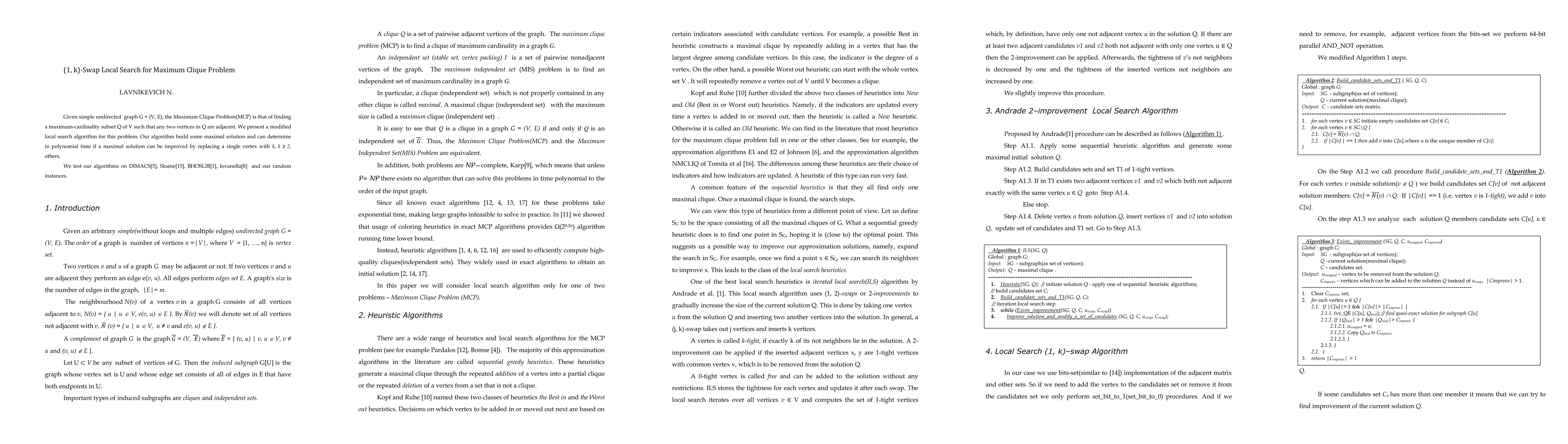 This paper proposes a modified local search algorithm for the Maximum Clique Problem, enabling the replacement of a single vertex with k others to improve solutions in polynomial time. The algorithm is tested on various benchmark datasets and random instances.