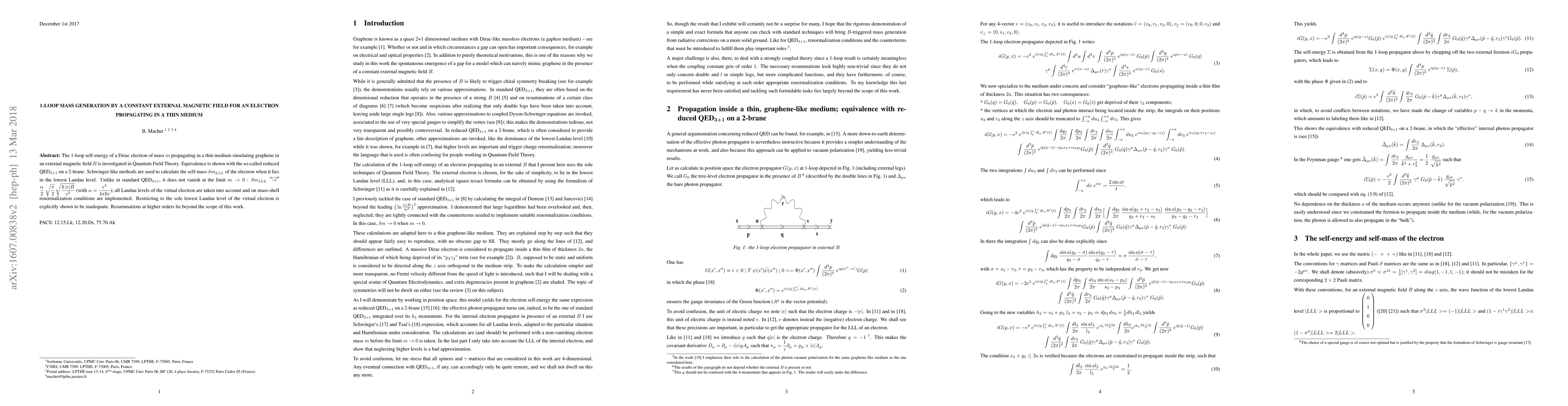 This research investigates the 1-loop self-energy of an electron in a medium mimicking graphene under an external magnetic field, finding that the electron's mass doesn't vanish even as its original mass approaches zero. Using Schwinger-like methods, it calculates the self-mass of the electron in the lowest Landau level, demonstrating that considering only the lowest Landau level is insufficient. The study establishes an equivalence with reduced QED_{3+1} on a 2-brane, revealing that all Landau levels of the virtual electron must be accounted for in mass-shell renormalization conditions.