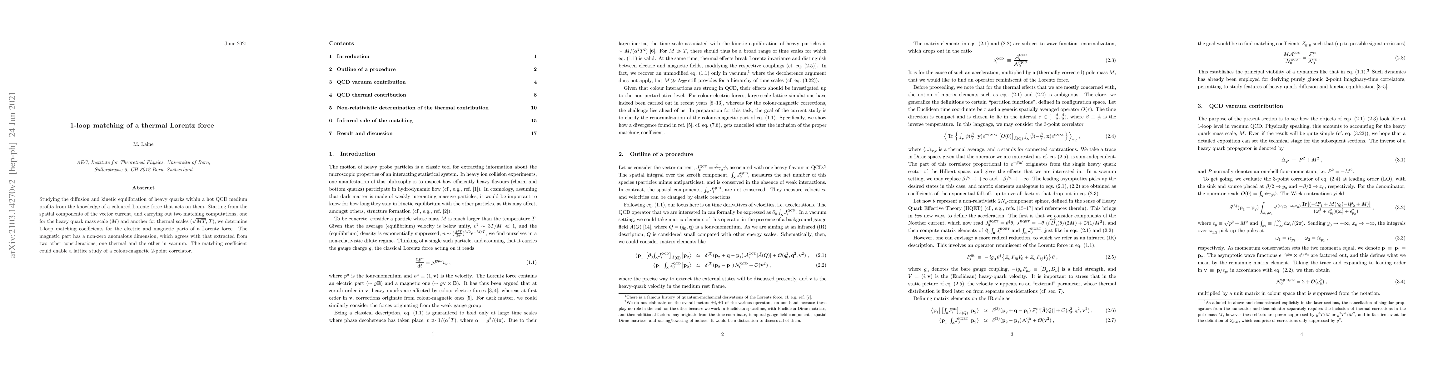 Studying the diffusion and kinetic equilibration of heavy quarks within a hot QCD medium profits from the knowledge of a coloured Lorentz force that acts on them. Starting from the spatial components of the vector current, and carrying out two matching computations, one for the heavy quark mass scale ($M$) and another for thermal scales ($\sqrt{MT}$, $T$), we determine 1-loop matching coefficients for the electric and magnetic parts of a Lorentz force. The magnetic part has a non-zero anomalous dimension, which agrees with that extracted from two other considerations, one thermal and the other in vacuum. The matching coefficient could enable a lattice study of a colour-magnetic 2-point correlator.