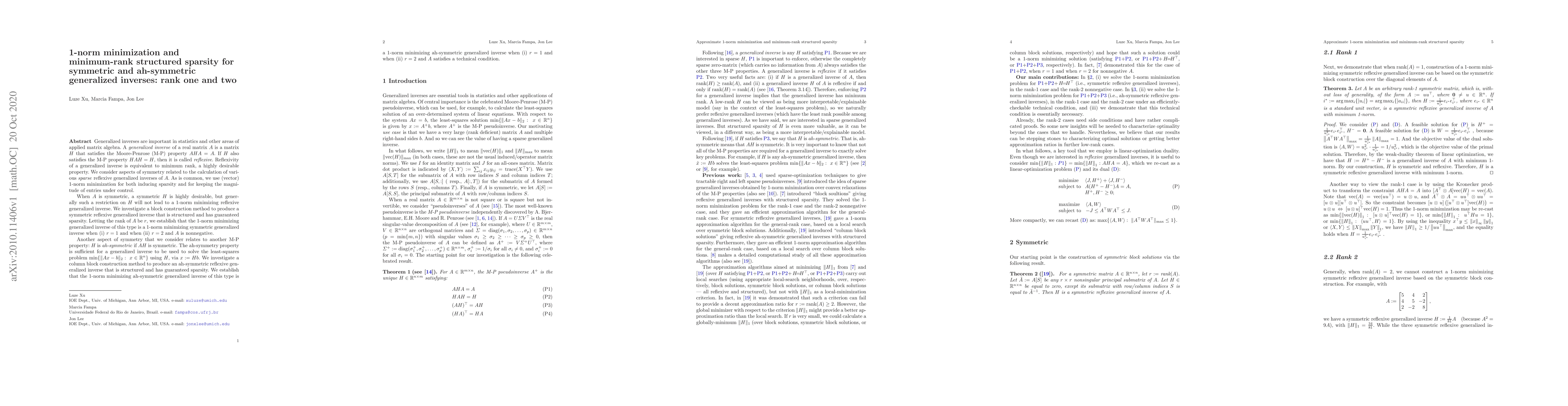 Generalized inverses are important in statistics and other areas of applied matrix algebra. A \emph{generalized inverse} of a real matrix $A$ is a matrix $H$ that satisfies the Moore-Penrose (M-P) property $AHA=A$. If $H$ also satisfies the M-P property $HAH=H$, then it is called \emph{reflexive}. Reflexivity of a generalized inverse is equivalent to minimum rank, a highly desirable property. We consider aspects of symmetry related to the calculation of various \emph{sparse} reflexive generalized inverses of $A$. As is common, we use (vector) 1-norm minimization for both inducing sparsity and for keeping the magnitude of entries under control. When $A$ is symmetric, a symmetric $H$ is highly desirable, but generally such a restriction on $H$ will not lead to a 1-norm minimizing reflexive generalized inverse. We investigate a block construction method to produce a symmetric reflexive generalized inverse that is structured and has guaranteed sparsity. Letting the rank of $A$ be $r$, we establish that the 1-norm minimizing generalized inverse of this type is a 1-norm minimizing symmetric generalized inverse when (i) $r=1$ and when (ii) $r=2$ and $A$ is nonnegative. Another aspect of symmetry that we consider relates to another M-P property: $H$ is \emph{ah-symmetric} if $AH$ is symmetric. The ah-symmetry property is sufficient for a generalized inverse to be used to solve the least-squares problem $\min\{\|Ax-b\|_2:~x\in\mathbb{R}^n\}$ using $H$, via $x:=Hb$. We investigate a column block construction method to produce an ah-symmetric reflexive generalized inverse that is structured and has guaranteed sparsity. We establish that the 1-norm minimizing ah-symmetric generalized inverse of this type is a 1-norm minimizing ah-symmetric generalized inverse when (i) $r=1$ and when (ii) $r=2$ and $A$ satisfies a technical condition.