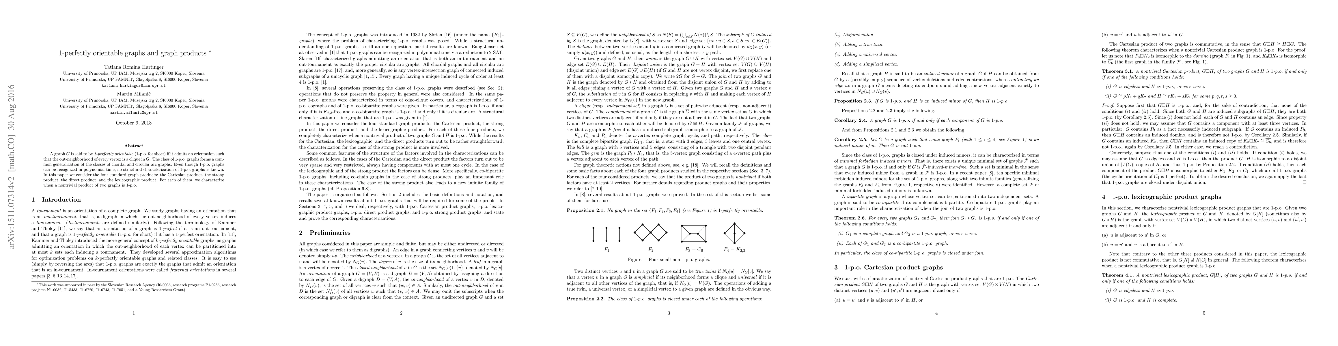 This paper explores the properties of 1-perfectly orientable (1-p.o.) graphs, which can be oriented such that each vertex's out-neighborhood forms a clique. It investigates the conditions under which nontrivial products of two graphs, using four standard graph product types, remain 1-p.o.