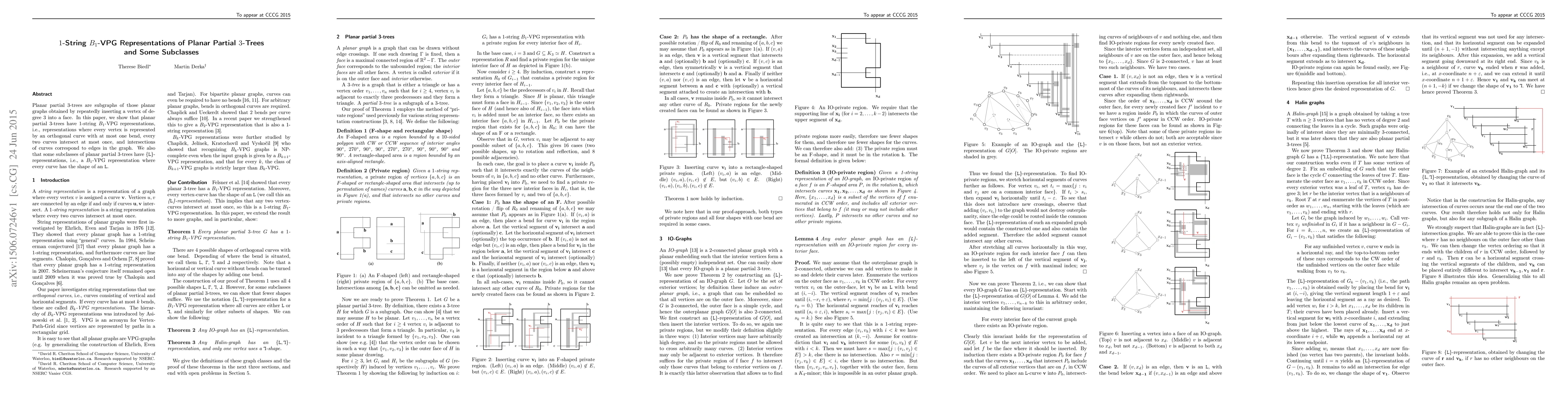 The work extends previous research on string graph representations by providing representations for planar partial 3-trees and specific graph subclasses (IO-graphs and Halin-graphs) using 1-string B1-VPG and L-representations.