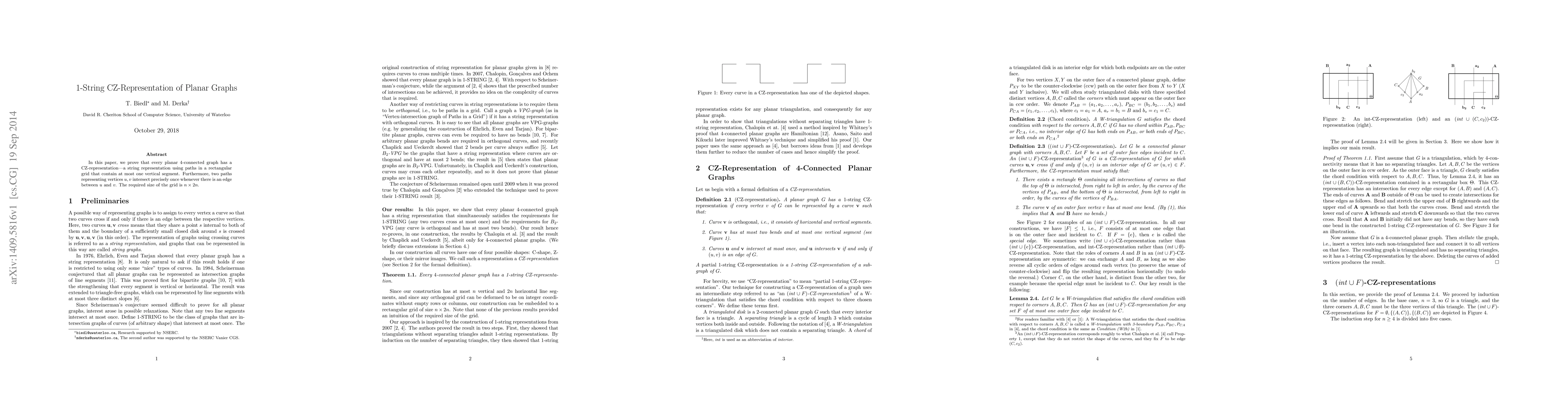 The paper proves that every planar 4-connected graph has a 1-string CZ-representation using paths in a rectangular grid with at most one vertical segment.