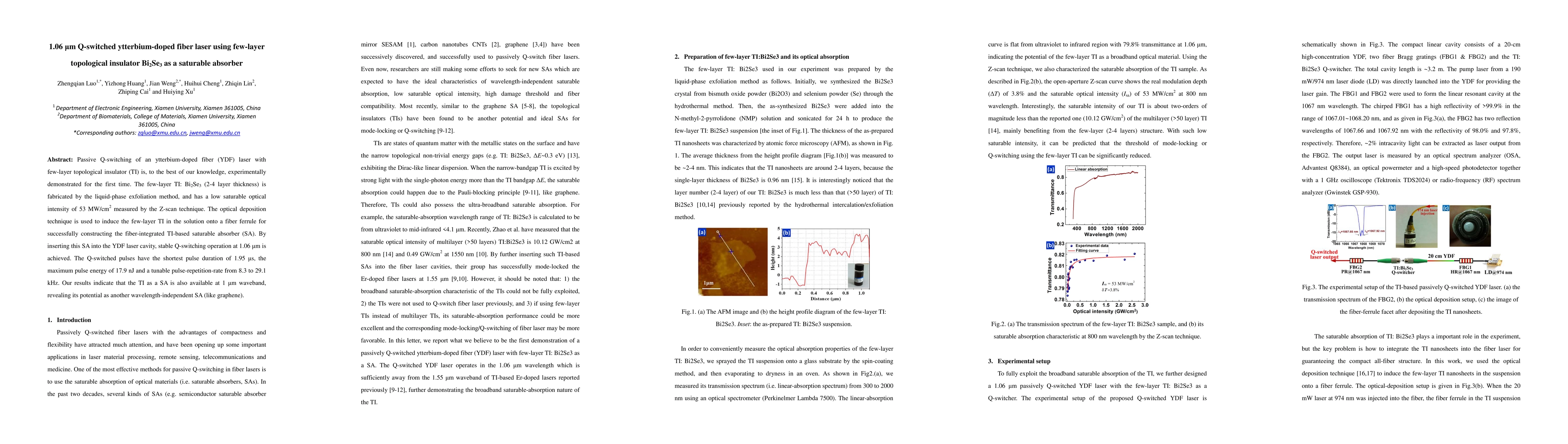This paper demonstrates the first experimental passive Q-switching of an ytterbium-doped fiber laser using a few-layer topological insulator Bi2Se3 as a saturable absorber. The resulting Q-switched pulses exhibit a short duration of 1.95 μs and a tunable repetition rate from 8.3 to 29.1 kHz.