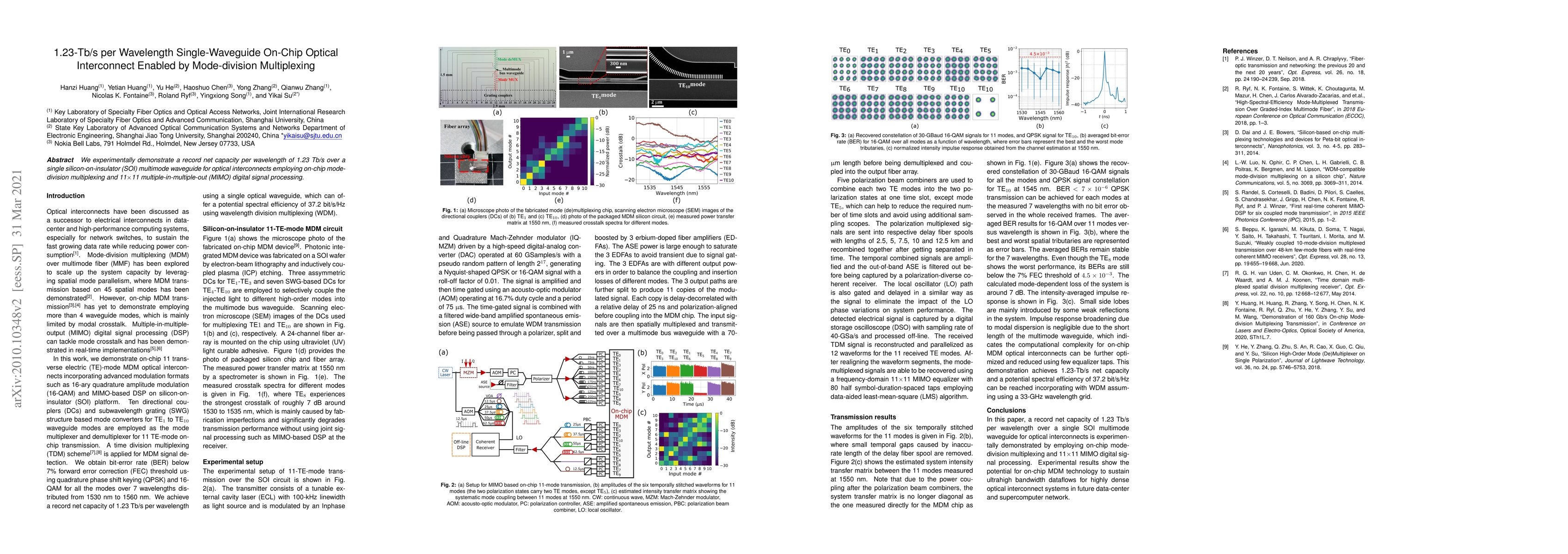 This research demonstrates a record net capacity of 1.23 Tb/s per wavelength using mode-division multiplexing in a single silicon-on-insulator multimode waveguide for on-chip optical interconnects, enhanced by 11×11 MIMO digital signal processing.
