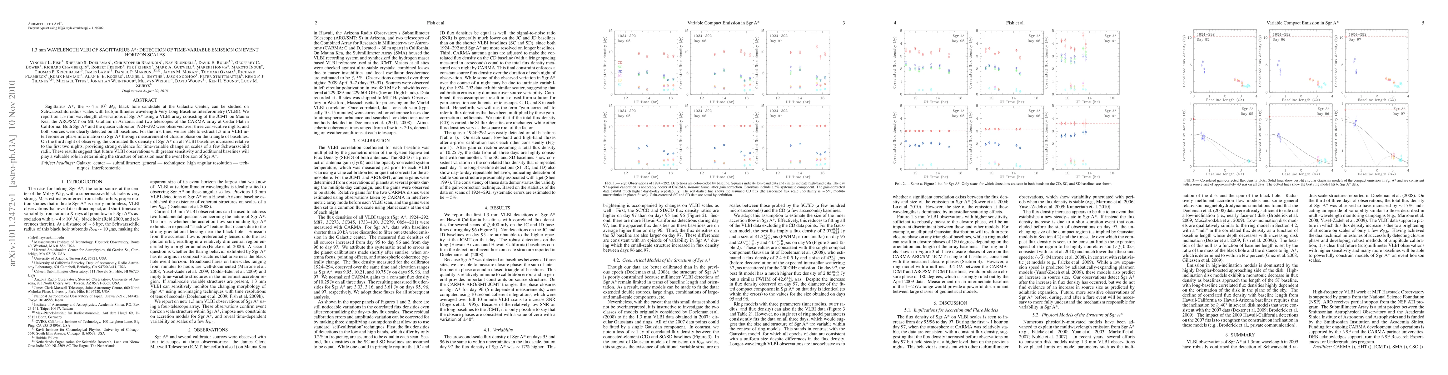 This paper reports on 1.3 mm wavelength Very Long Baseline Interferometry (VLBI) observations of Sagittarius A* using a multi-telescope array, revealing time-variable emission on scales of a few Schwarzschild radii for the first time. Future VLBI observations are anticipated to further elucidate the emission structure near the event horizon of Sagittarius A*.